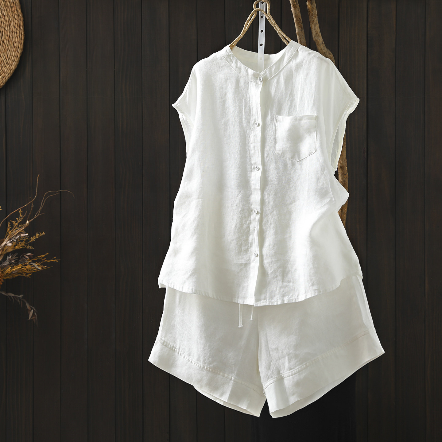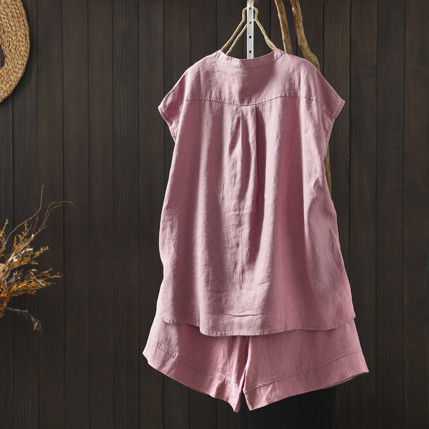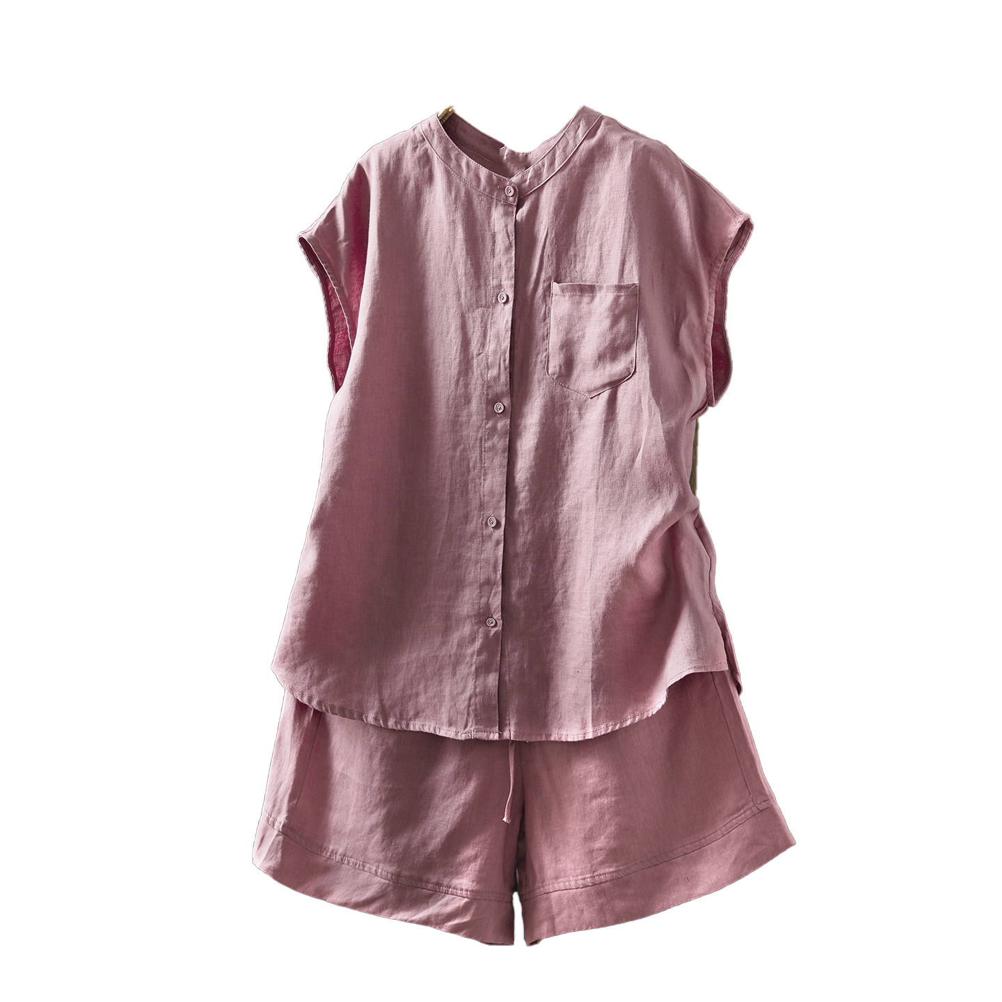 套装2026新款今年流行爆款女装夏季超火休闲粉色亚麻短袖衬衫短裤