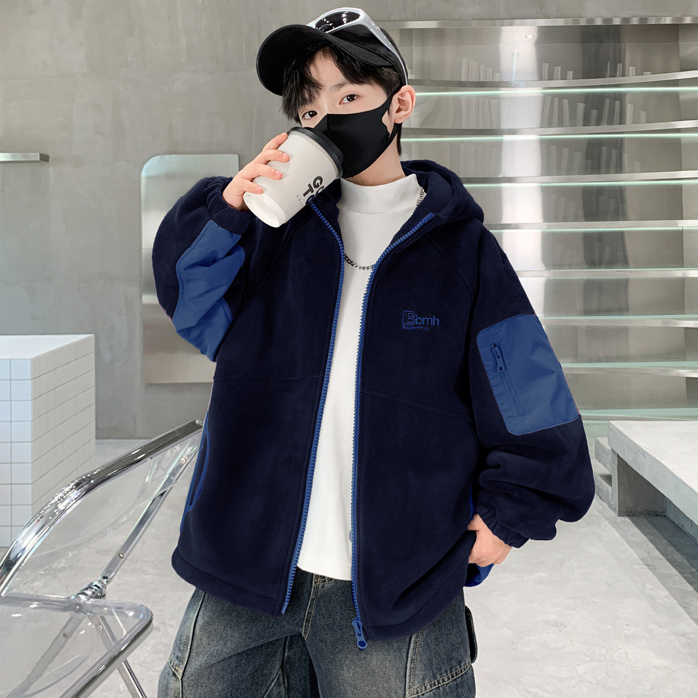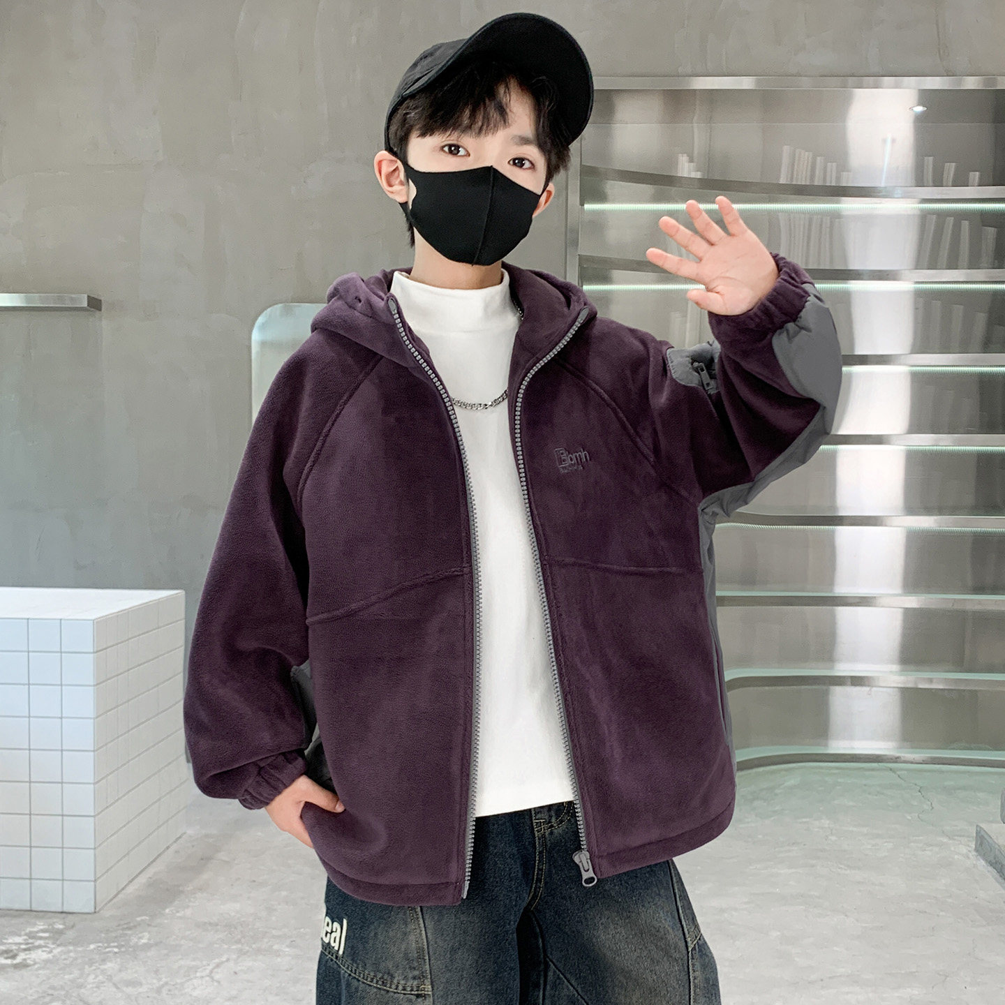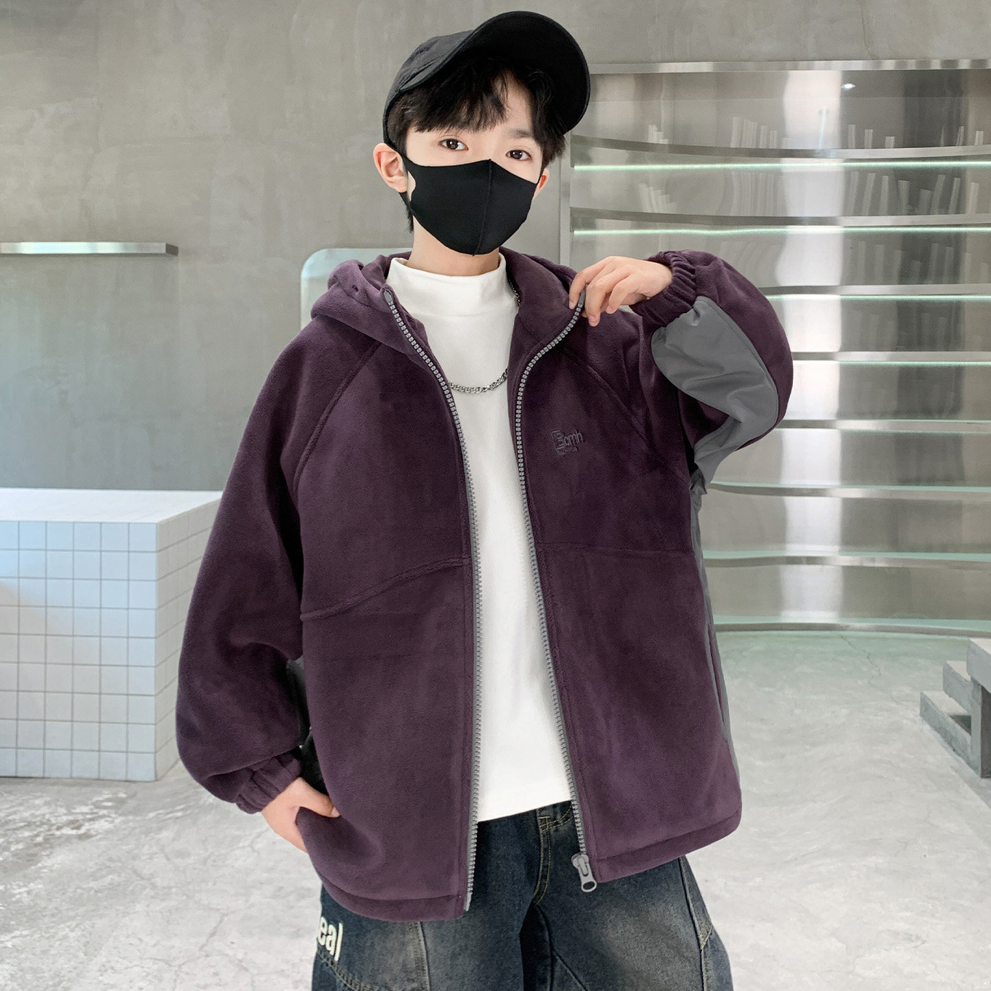 男童外套秋冬款2026新款加绒加厚中大儿童冬季摇粒绒夹克连帽上衣