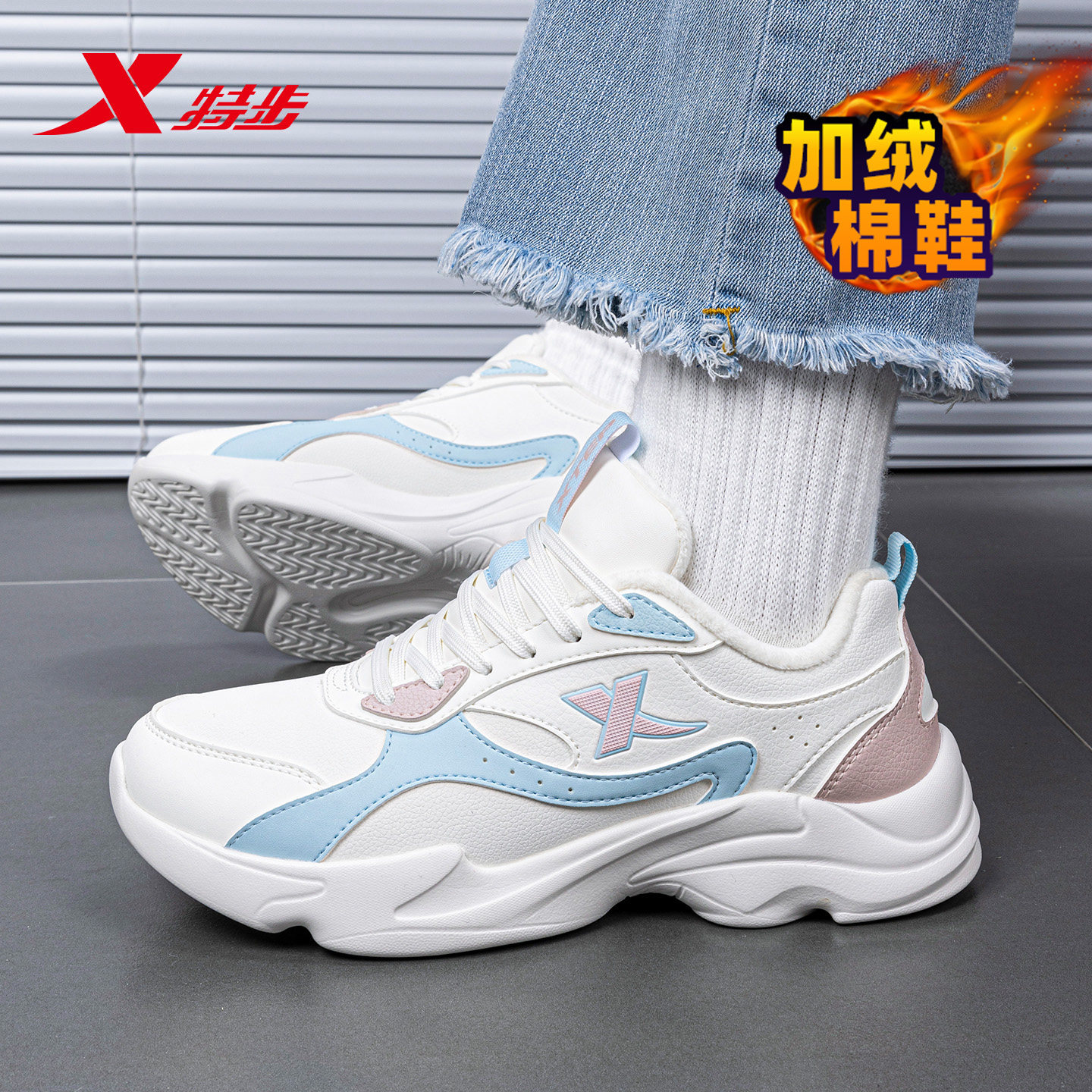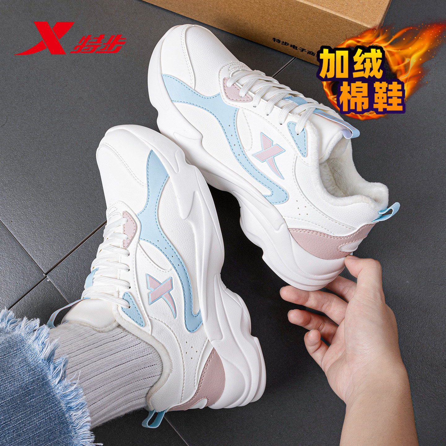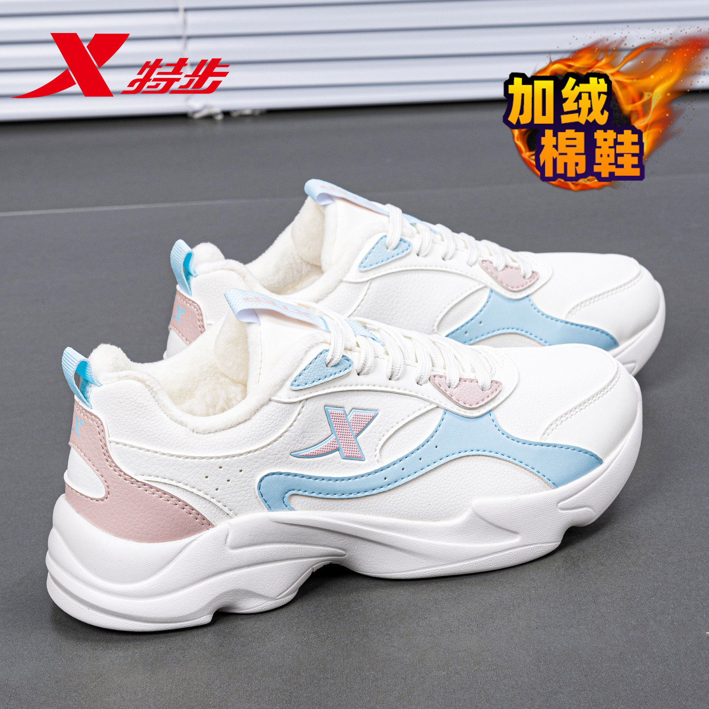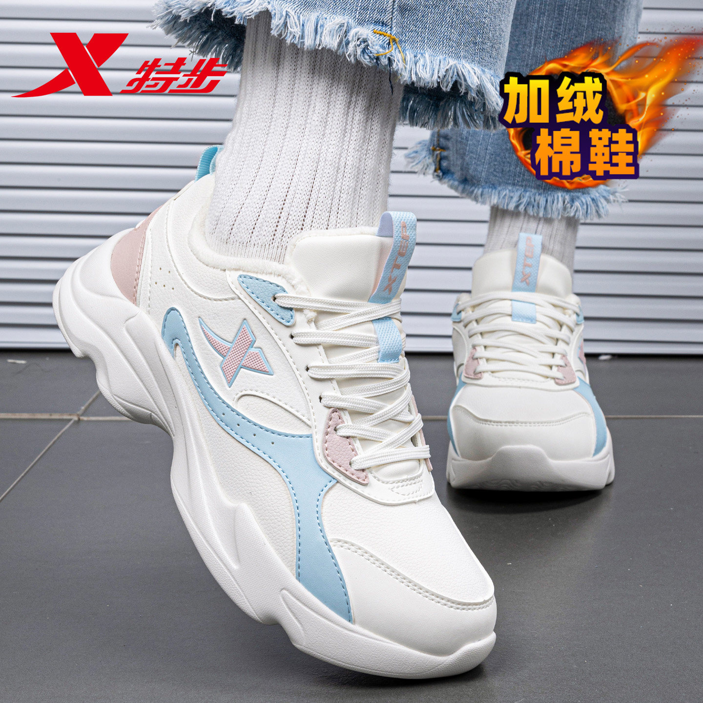 特步官方旗舰店女鞋运动鞋春季棉鞋皮面防水加绒保暖加厚休闲鞋子
