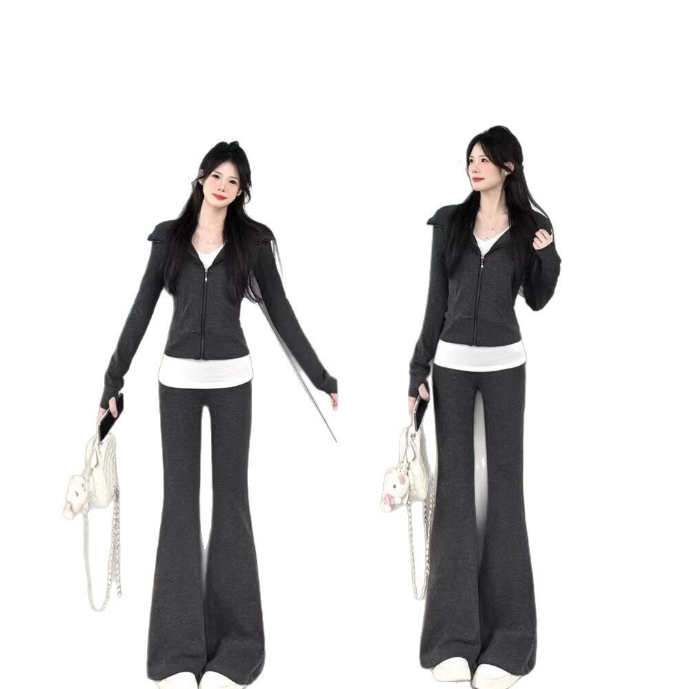 灰色条纹休闲运动套装女卫衣2026春季新款女装小个子连帽外套春装