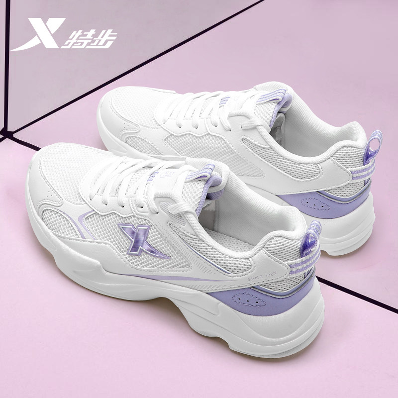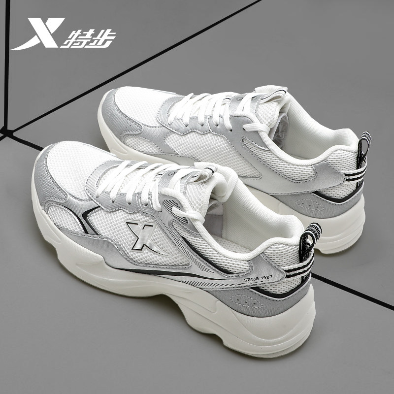 特步女鞋跑步休闲鞋官方旗舰店正品新款春季网面透气银色运动鞋女