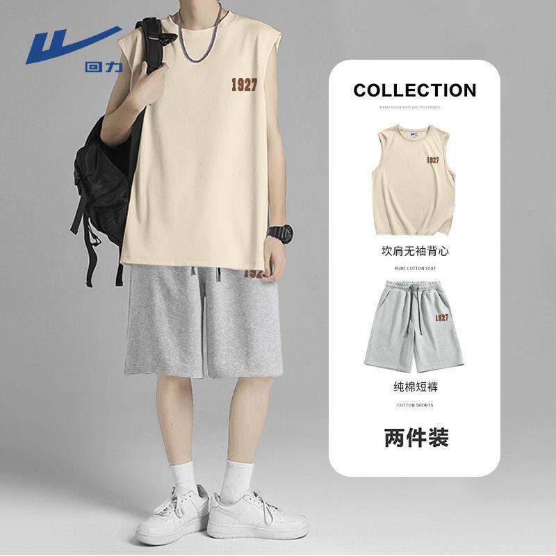 夏季纯棉背心短裤套装男士百搭无袖坎肩运动健身篮球服两件装