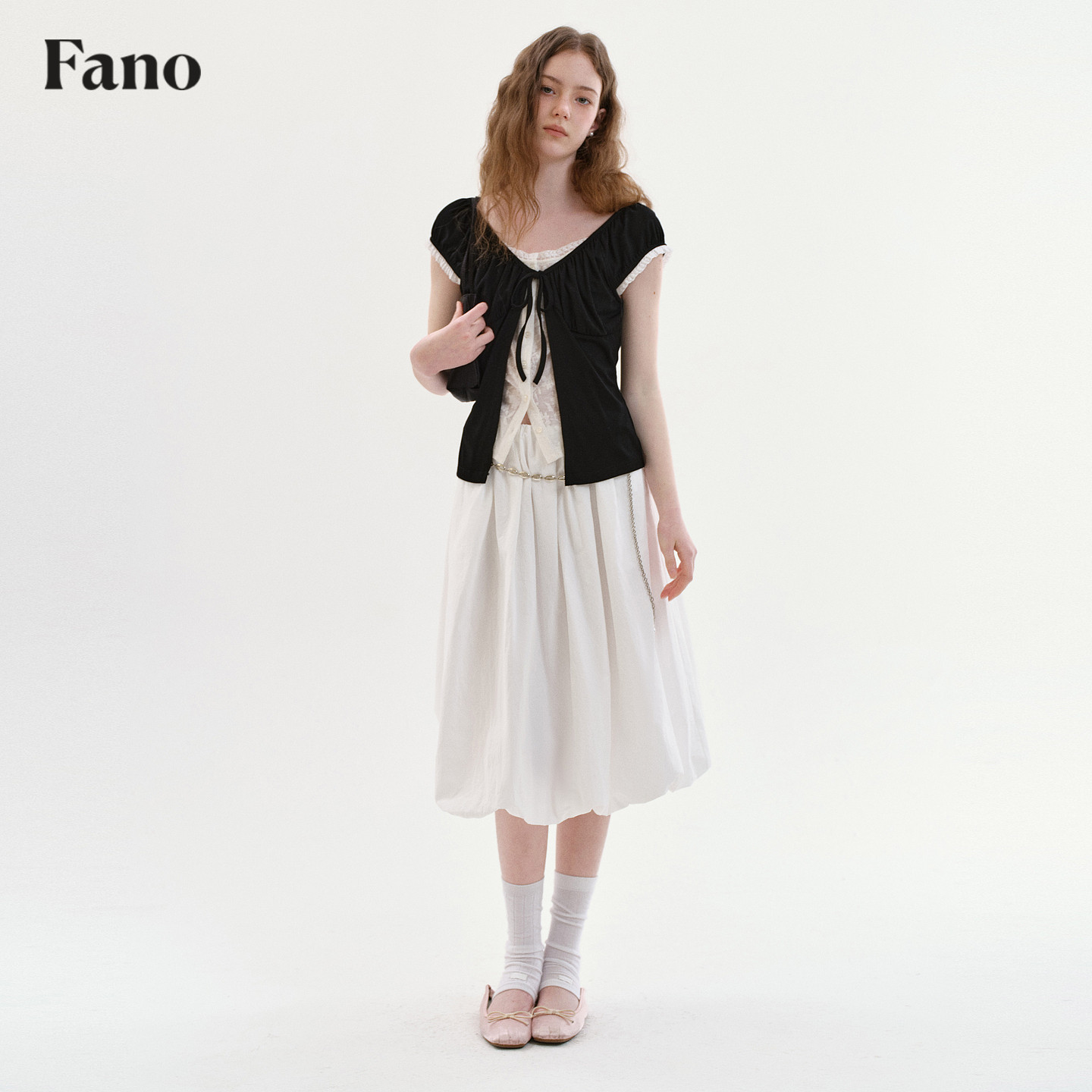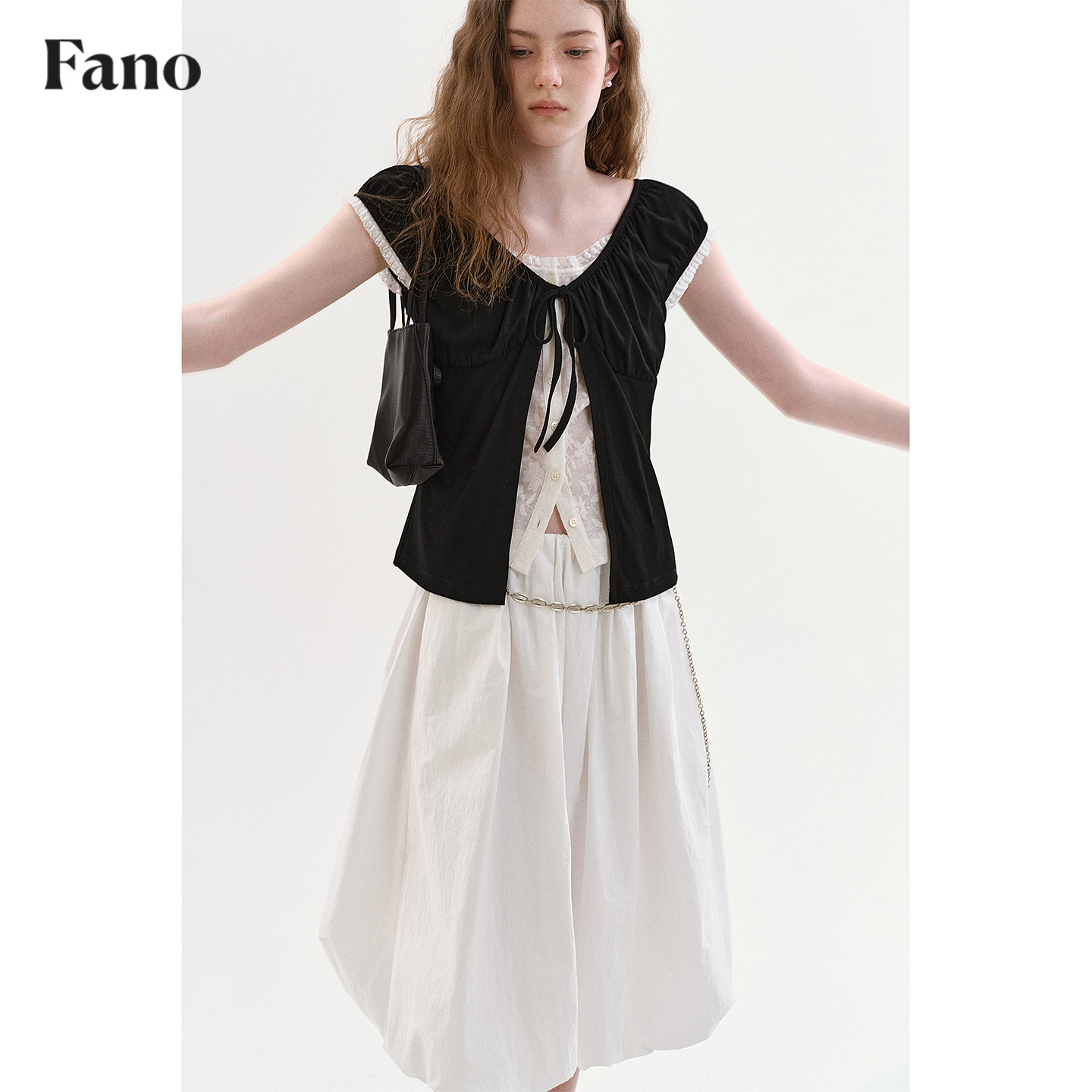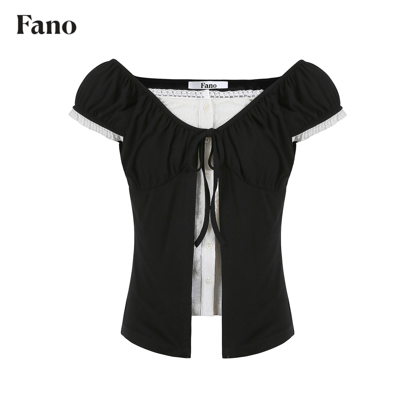 范洛Fano 法式慵懒感撞色假两件女2026夏季新款泡泡短袖蕾丝上衣