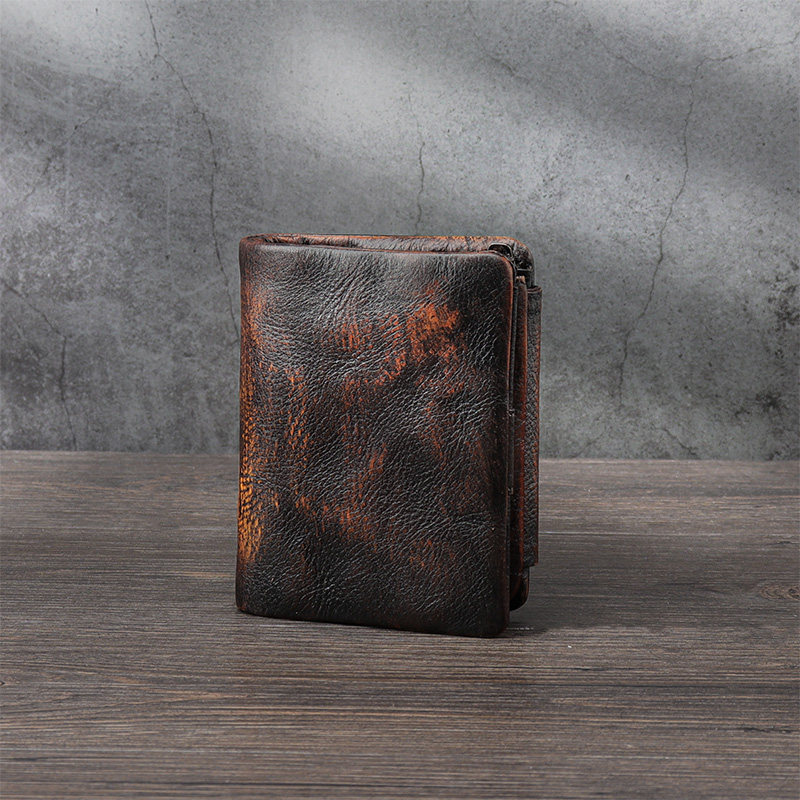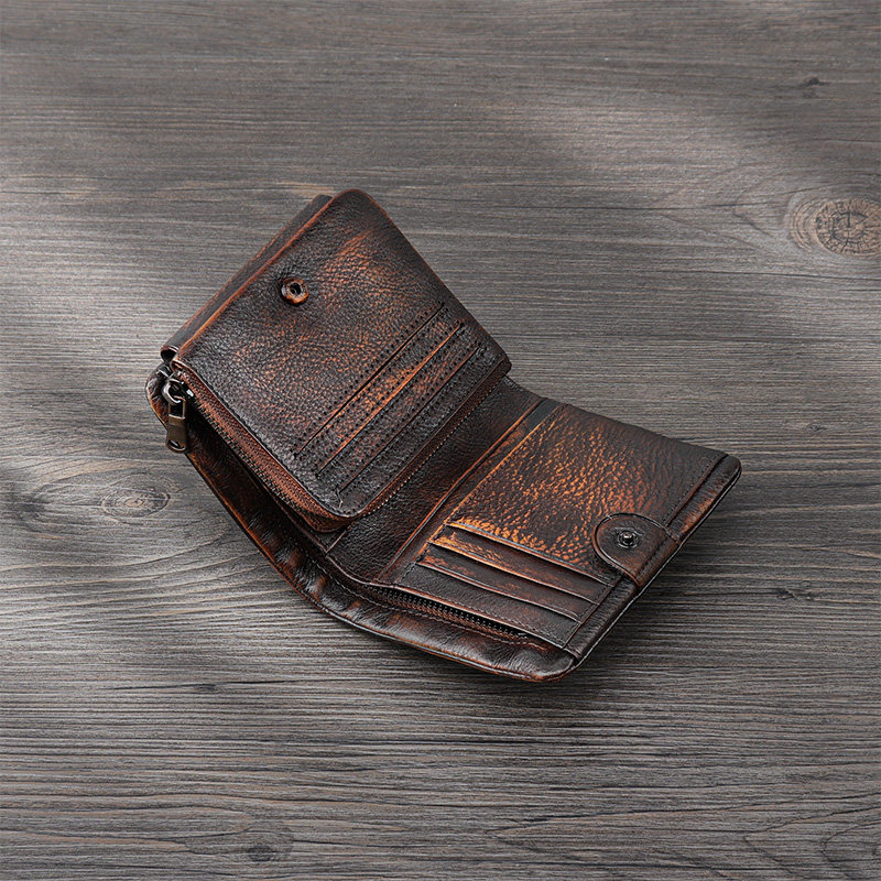 新款真皮短款钱包头层牛皮复古做旧手工擦色零钱包休闲多卡位钱夹
