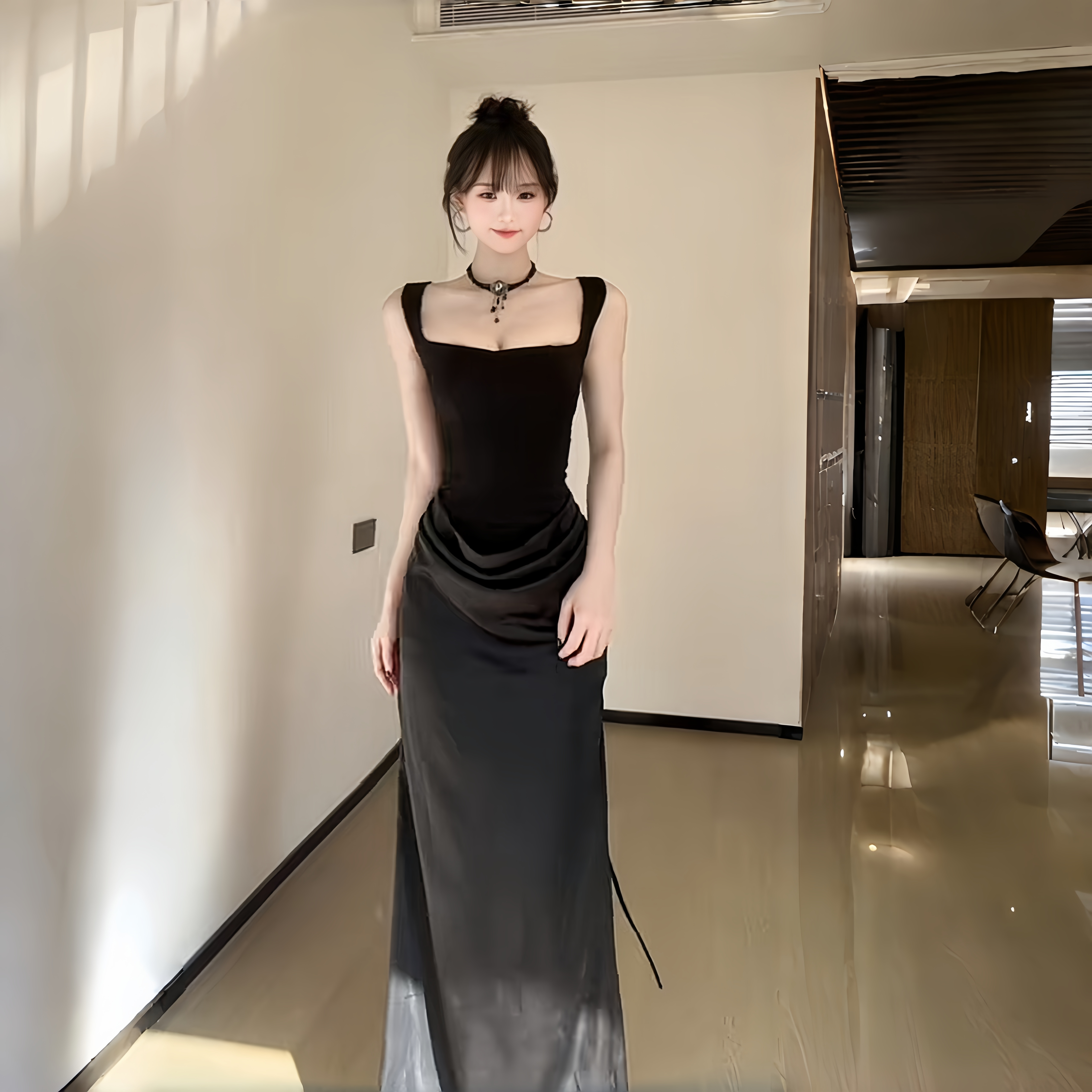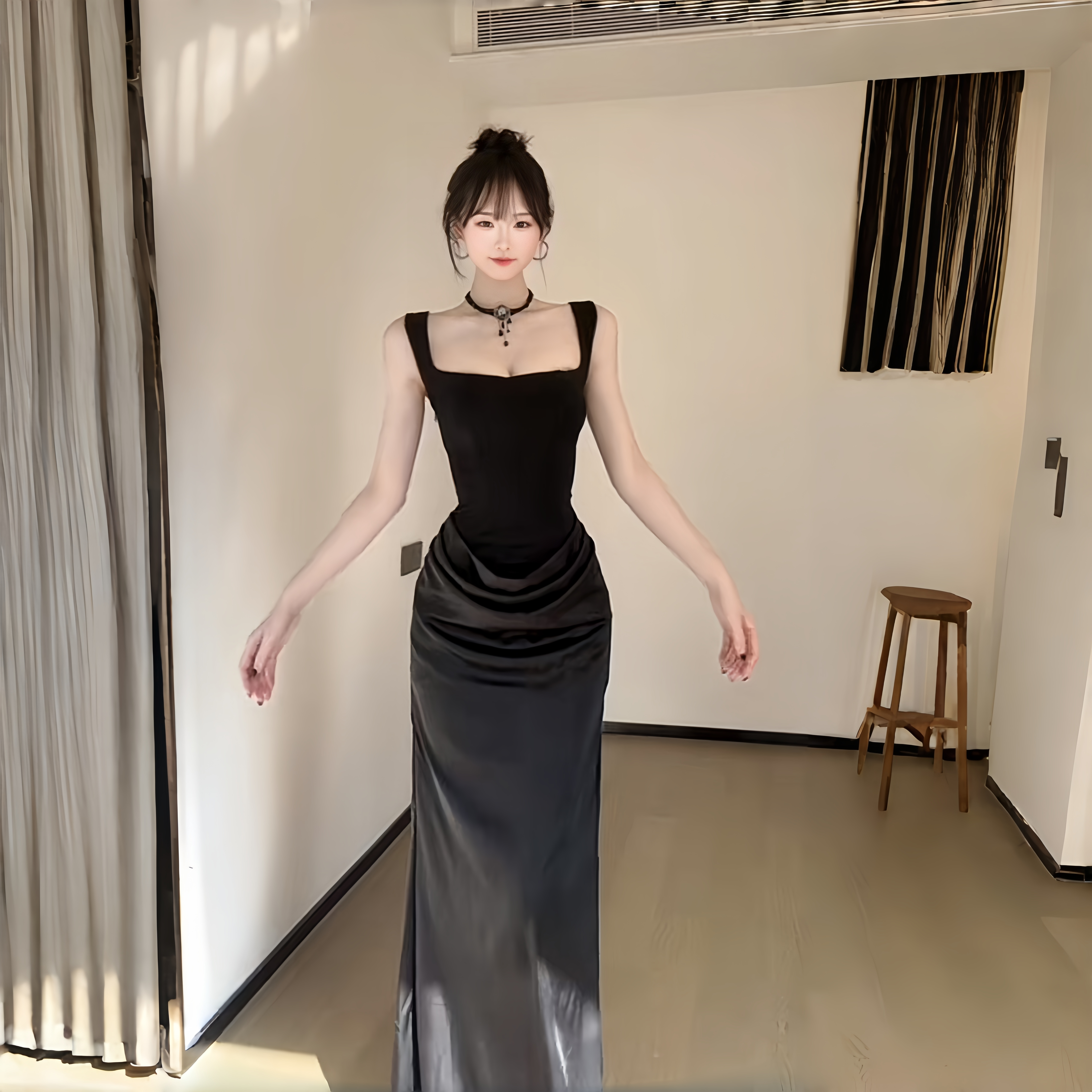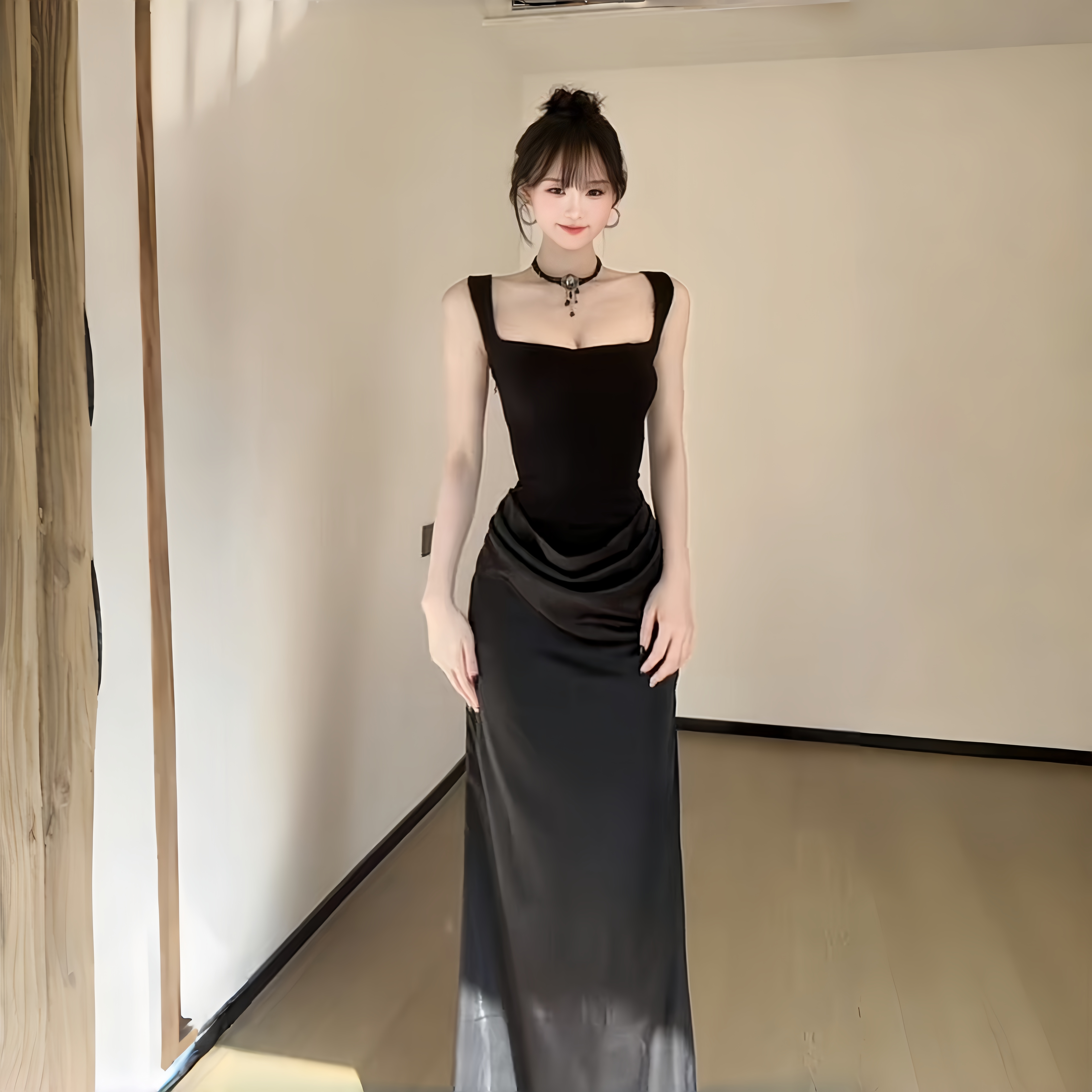 INSTUNNING法式黑色吊带鱼骨方领连衣裙女高级感修身内搭气质长裙