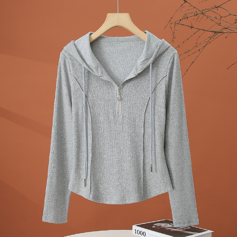 春季长袖连帽t恤女2026新款洋气时尚小衫小个子修身短款白色上衣