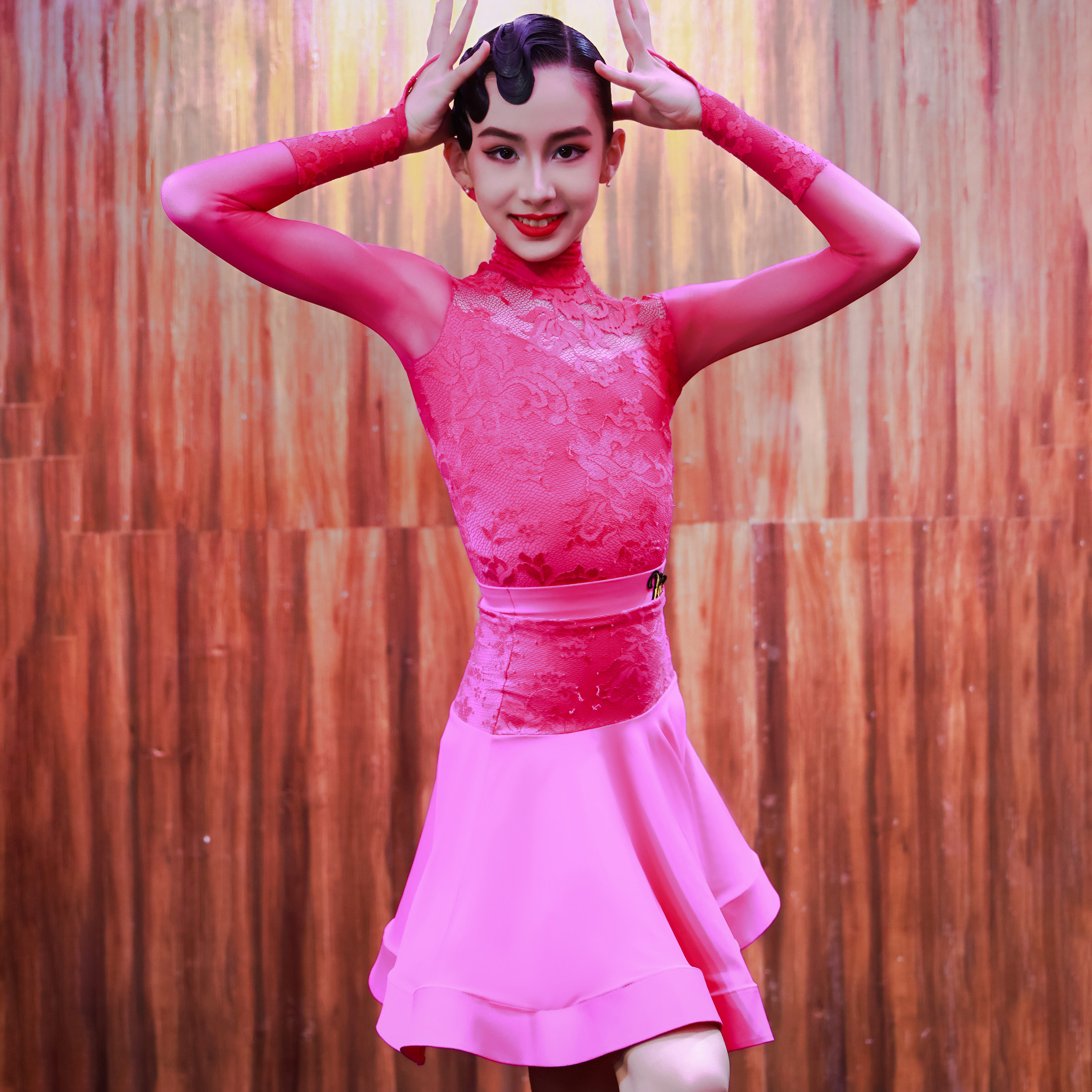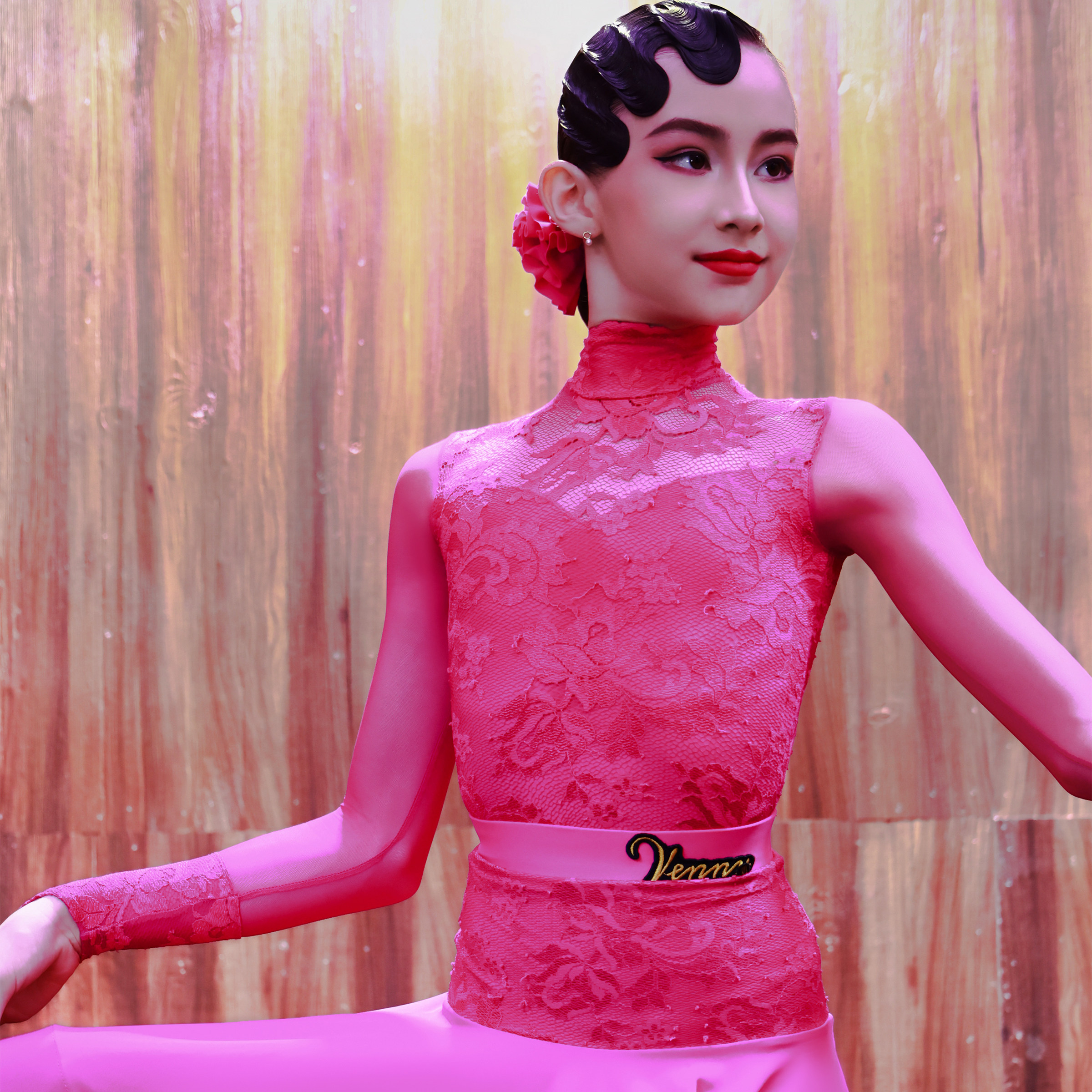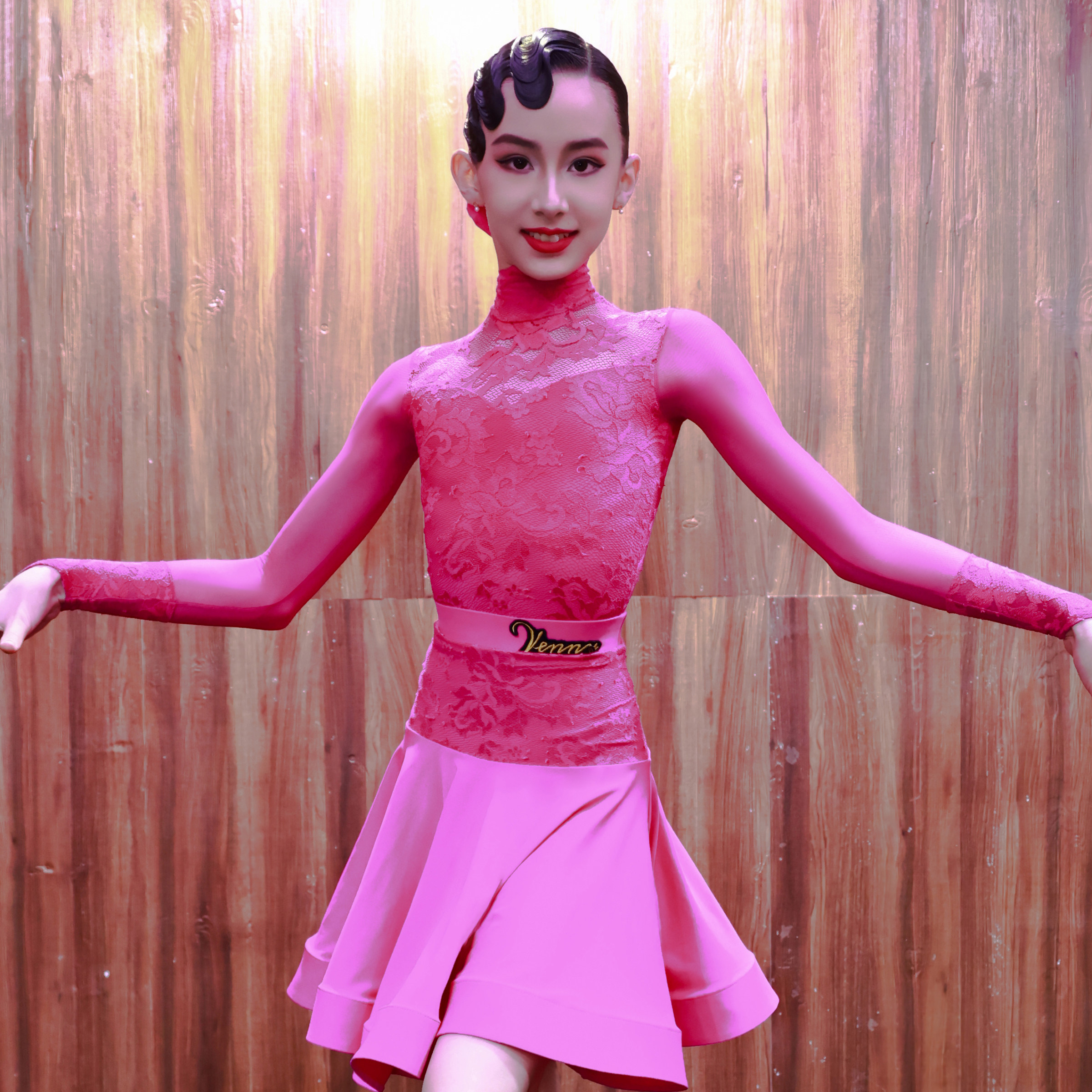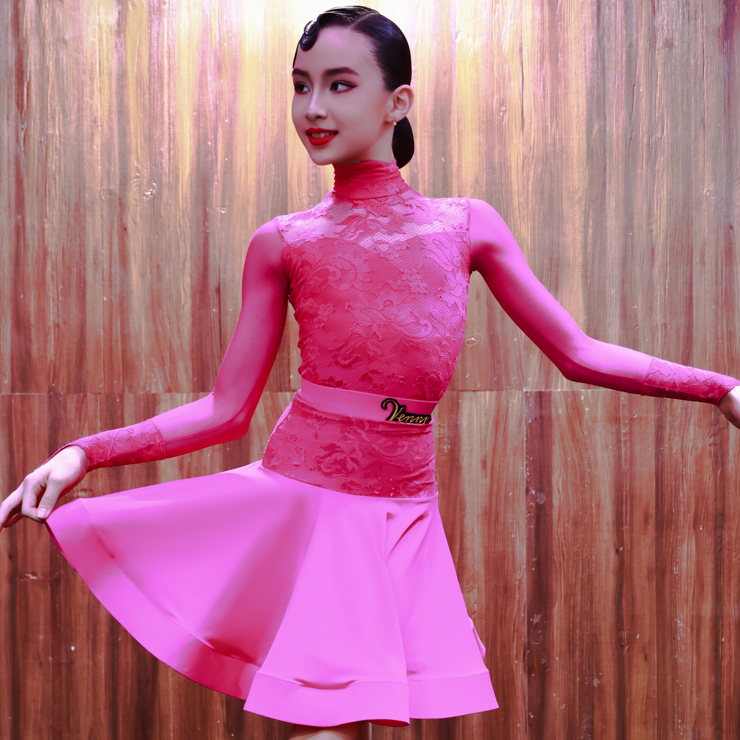 Venny薇妮拉丁舞比赛服女儿童高领鱼骨裙蕾丝网纱长袖演出规定服