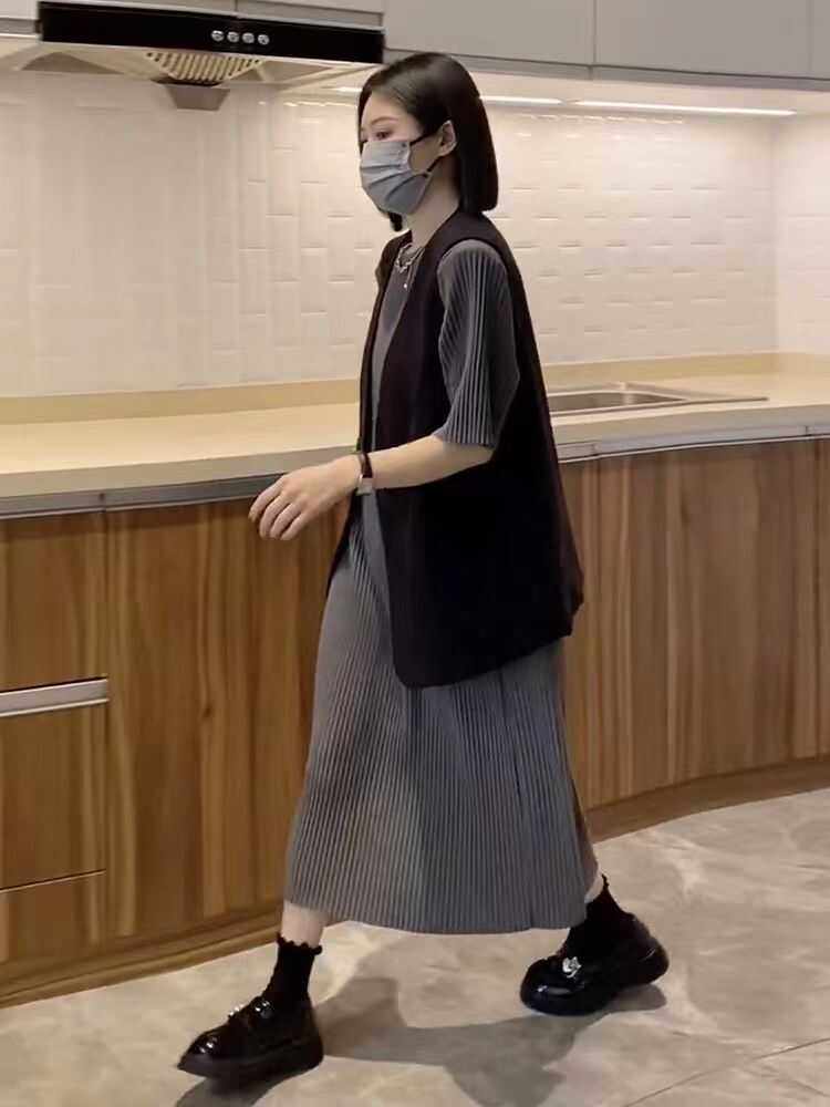 特大码300斤胖MM薄连衣裙夏季洋气薄款穿搭马甲T恤两件套百搭显瘦