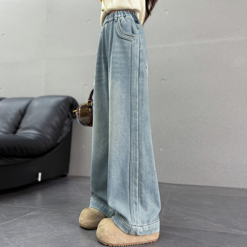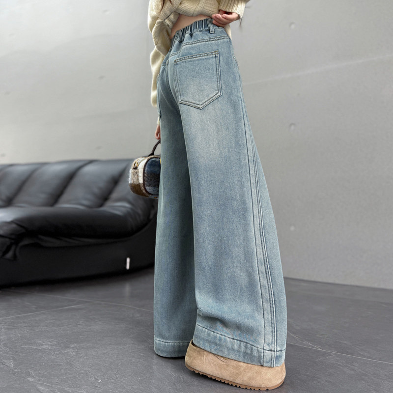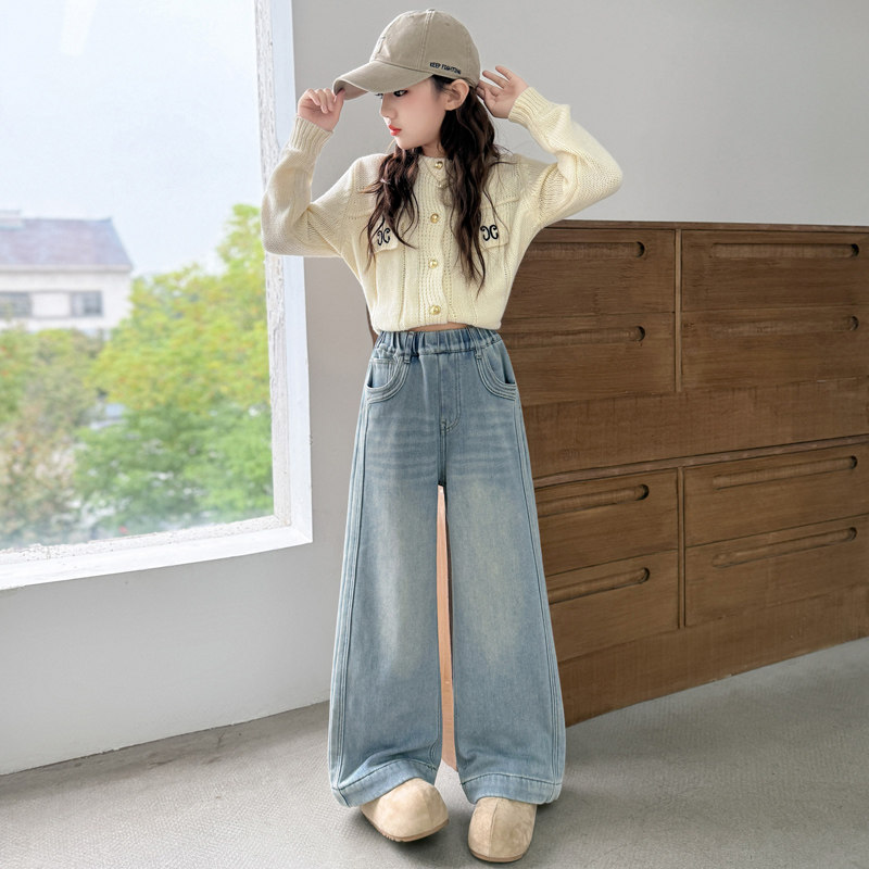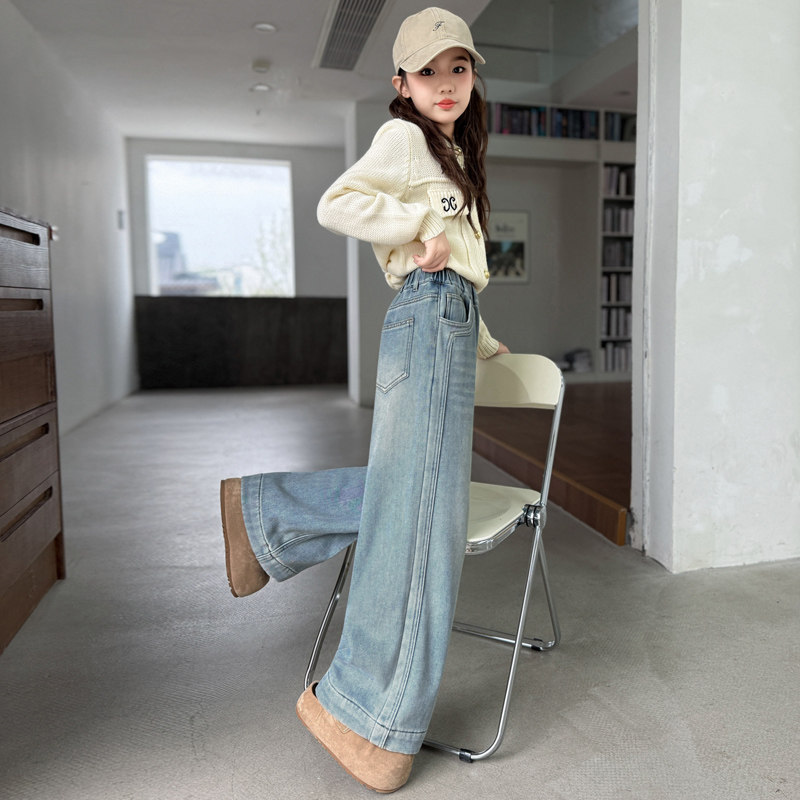 女童牛仔裤春装2026新款儿童直筒阔腿裤初中生学生浅蓝色裤子大童