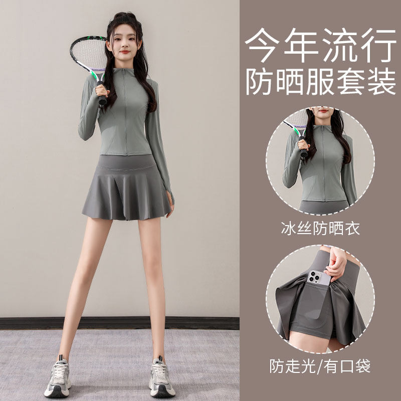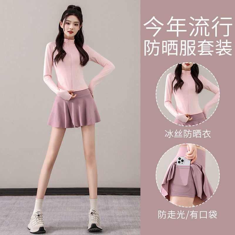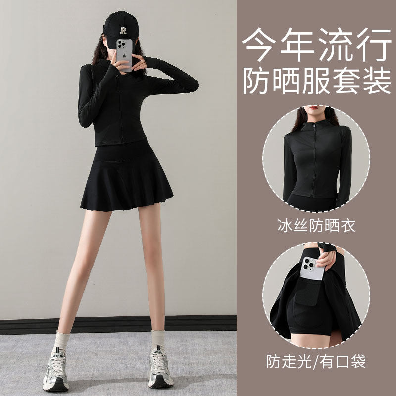 跑步运动套装女夏季冰丝防晒衣羽毛球服网球裙晨跑服休闲百褶短裙