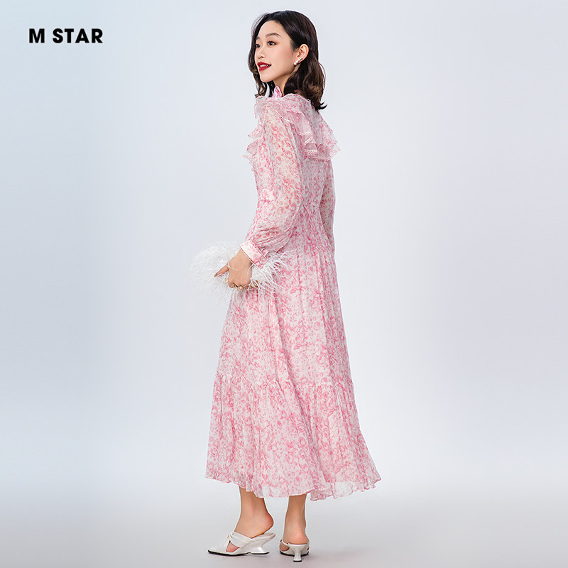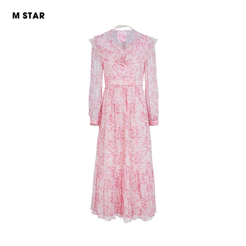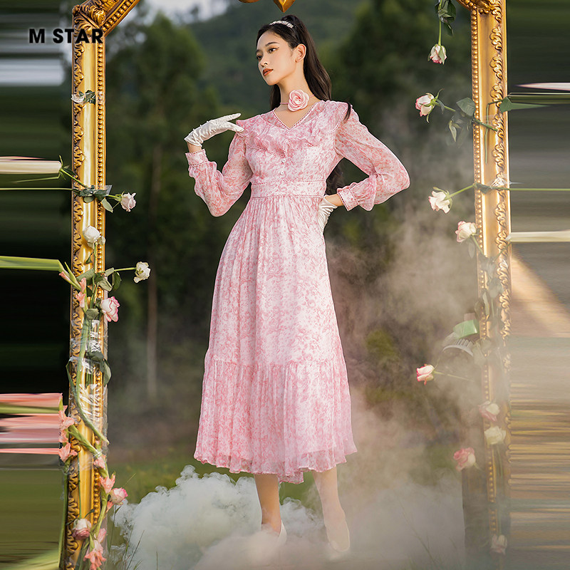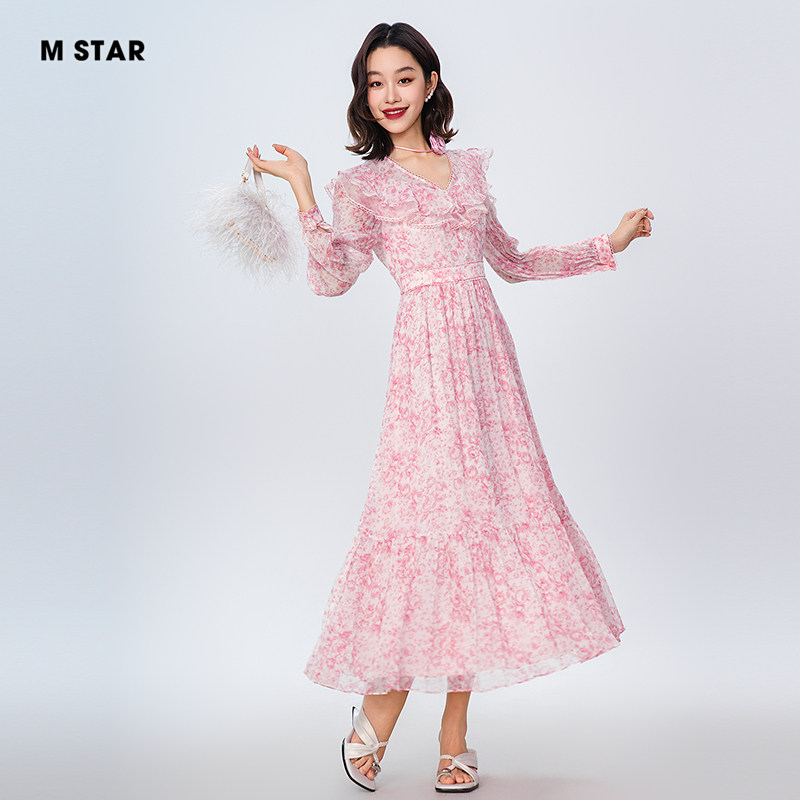 M STAR春夏新款法式碎花V领长袖桑蚕丝连衣裙飘逸中长款度假女士
