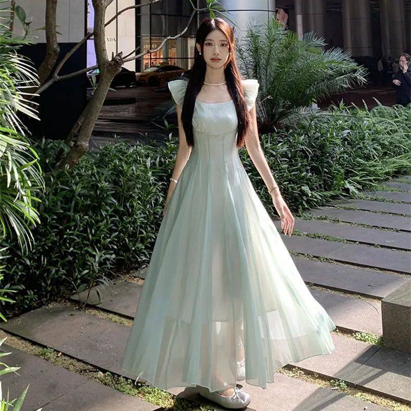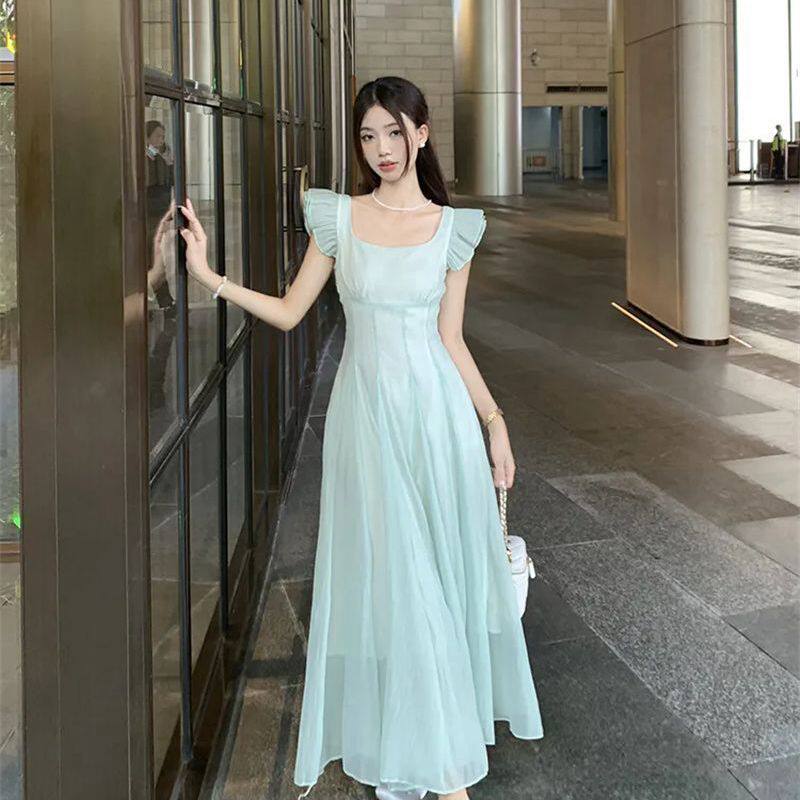 法式甜美方领小飞袖连衣裙女夏季度假风修身长裙温柔收腰a字裙子