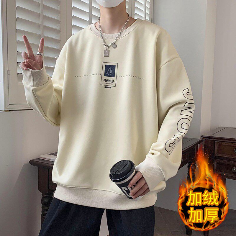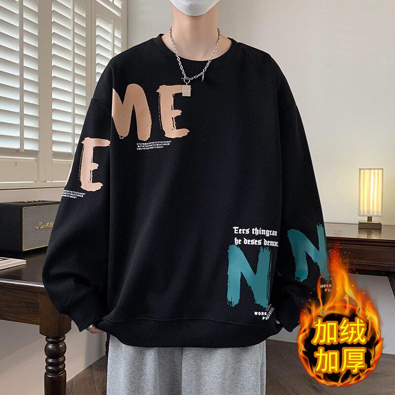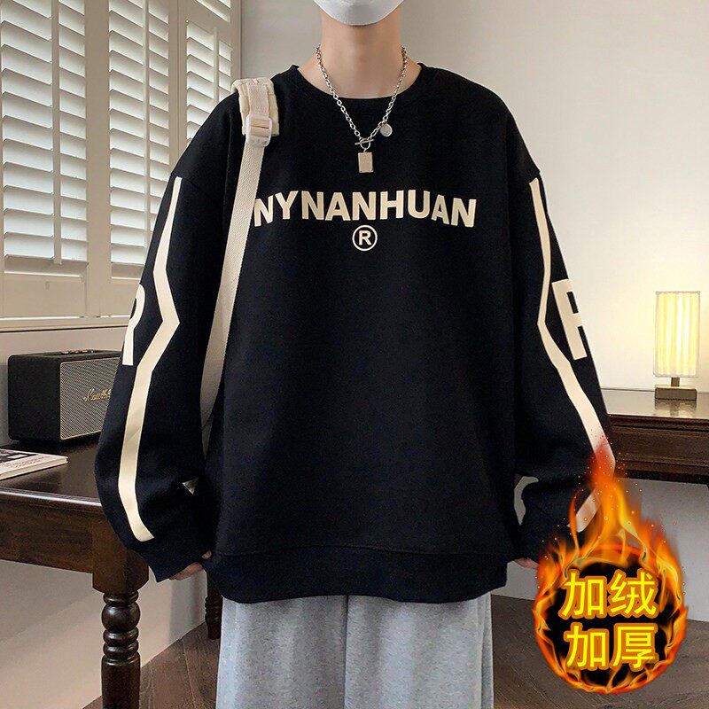 青少年秋冬季加绒圆领卫衣男孩初中高中学生帅气大童秋装保暖上衣