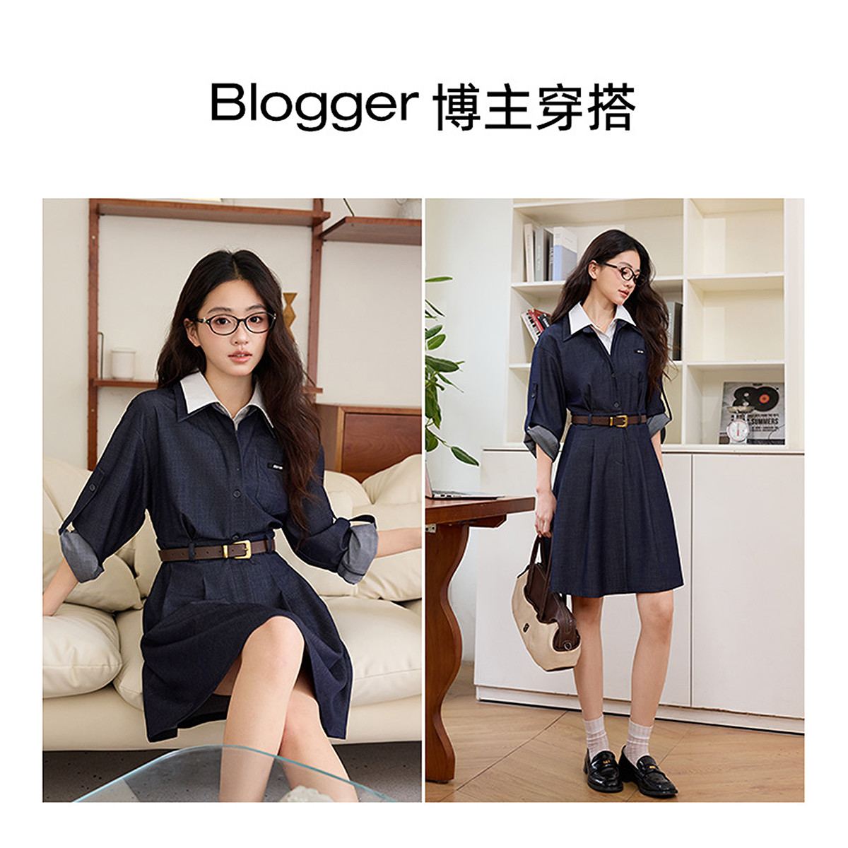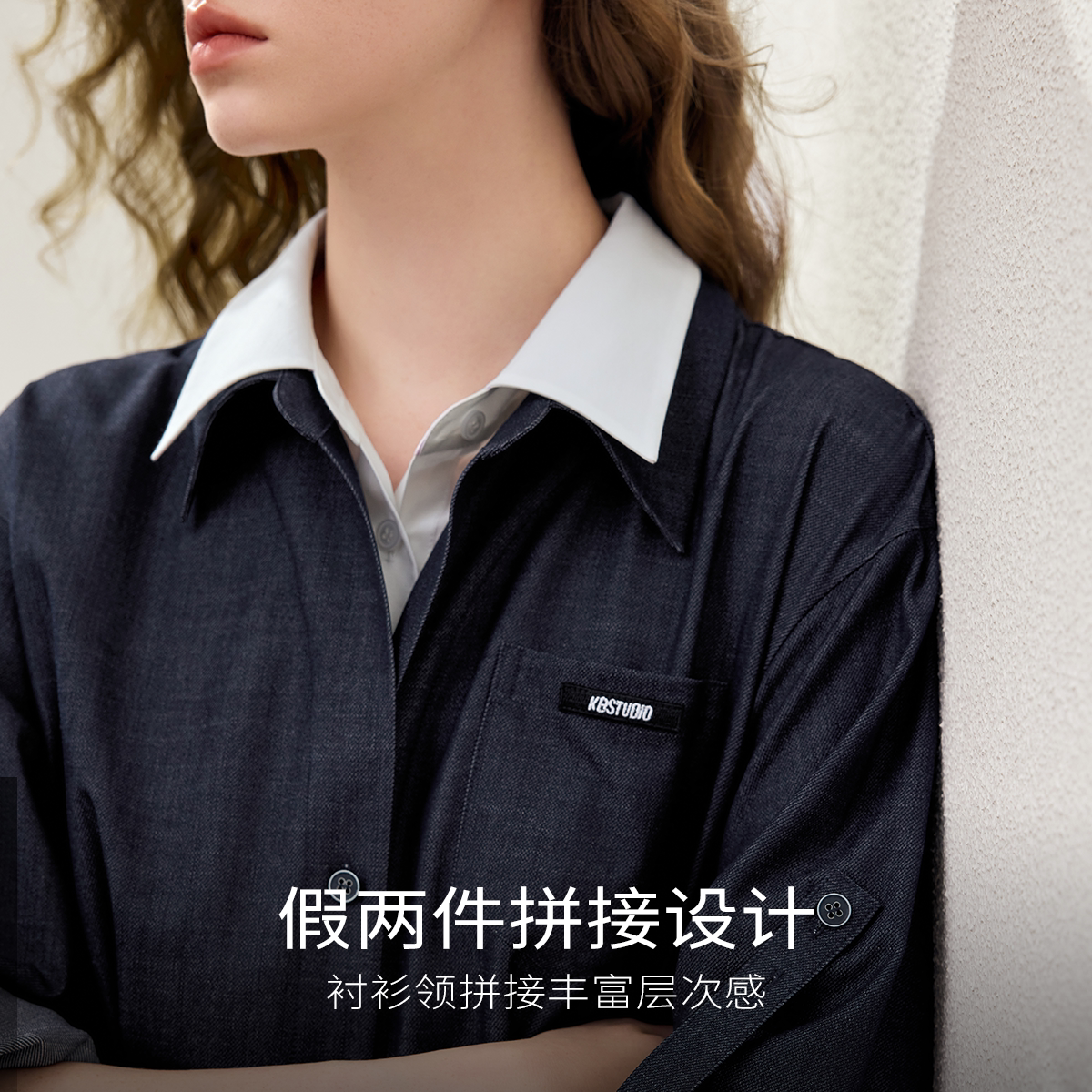 KBNE小个子收腰假两件仿牛仔连衣裙女2026春季新款气质长袖衬衫裙