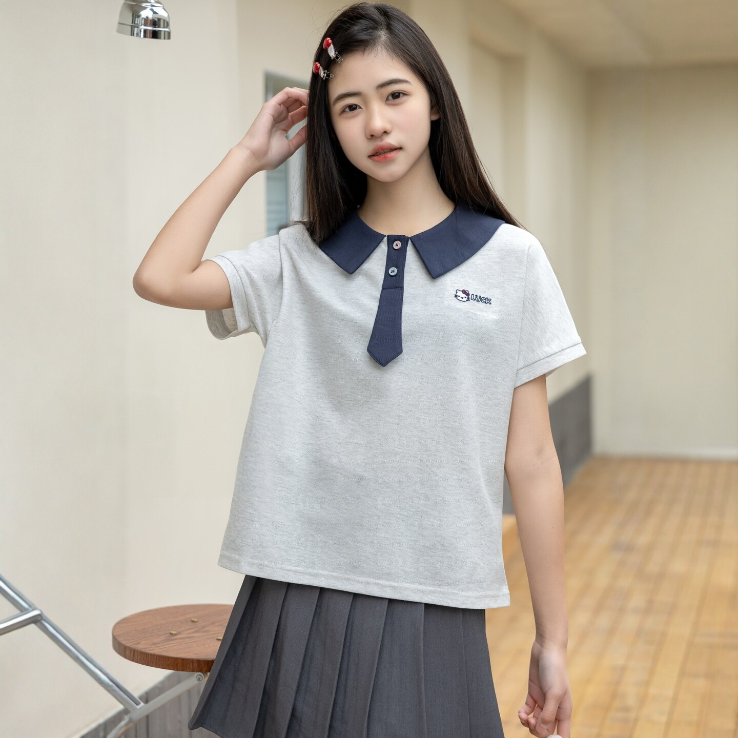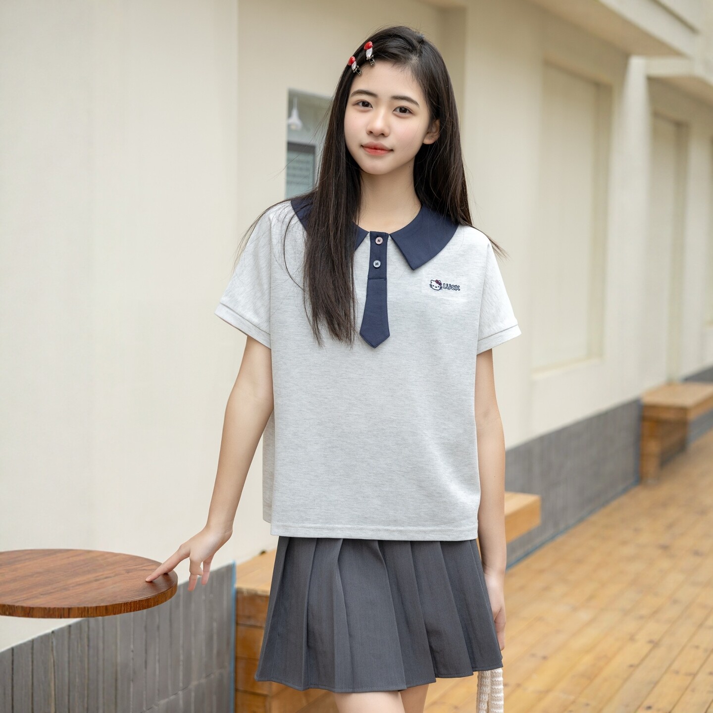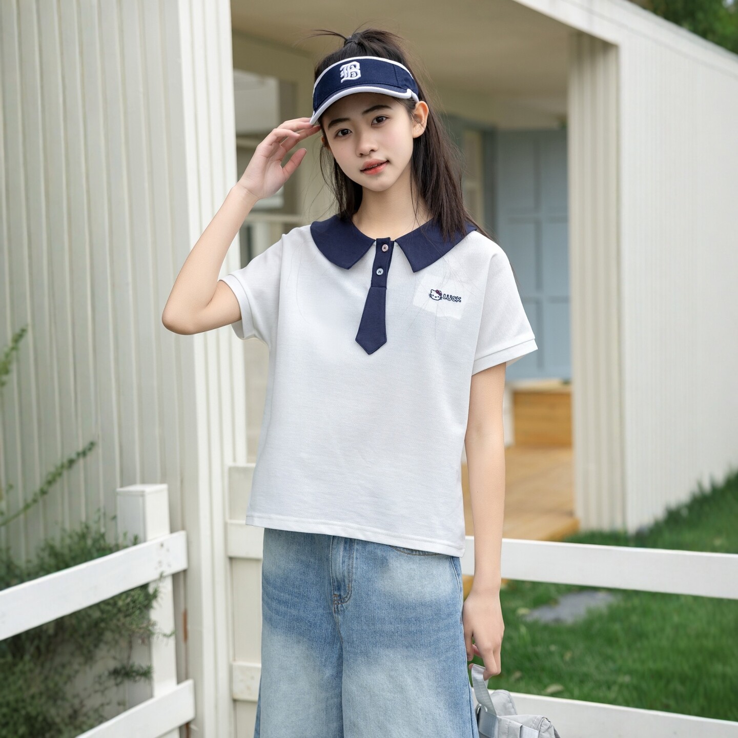 娃娃领短袖针织T恤衫学院风微笑天地夏季新款女孩中大童青少年装