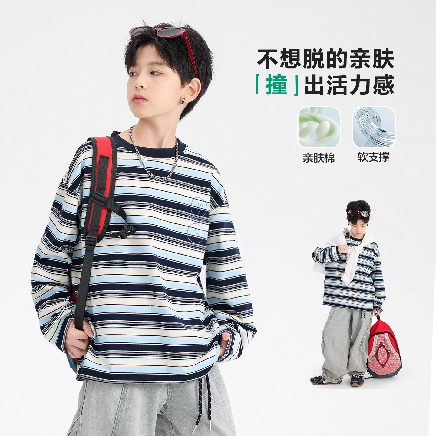 男童春装韩范撞色条纹长袖t恤2026新款青少年儿童运动宽松薄上衣