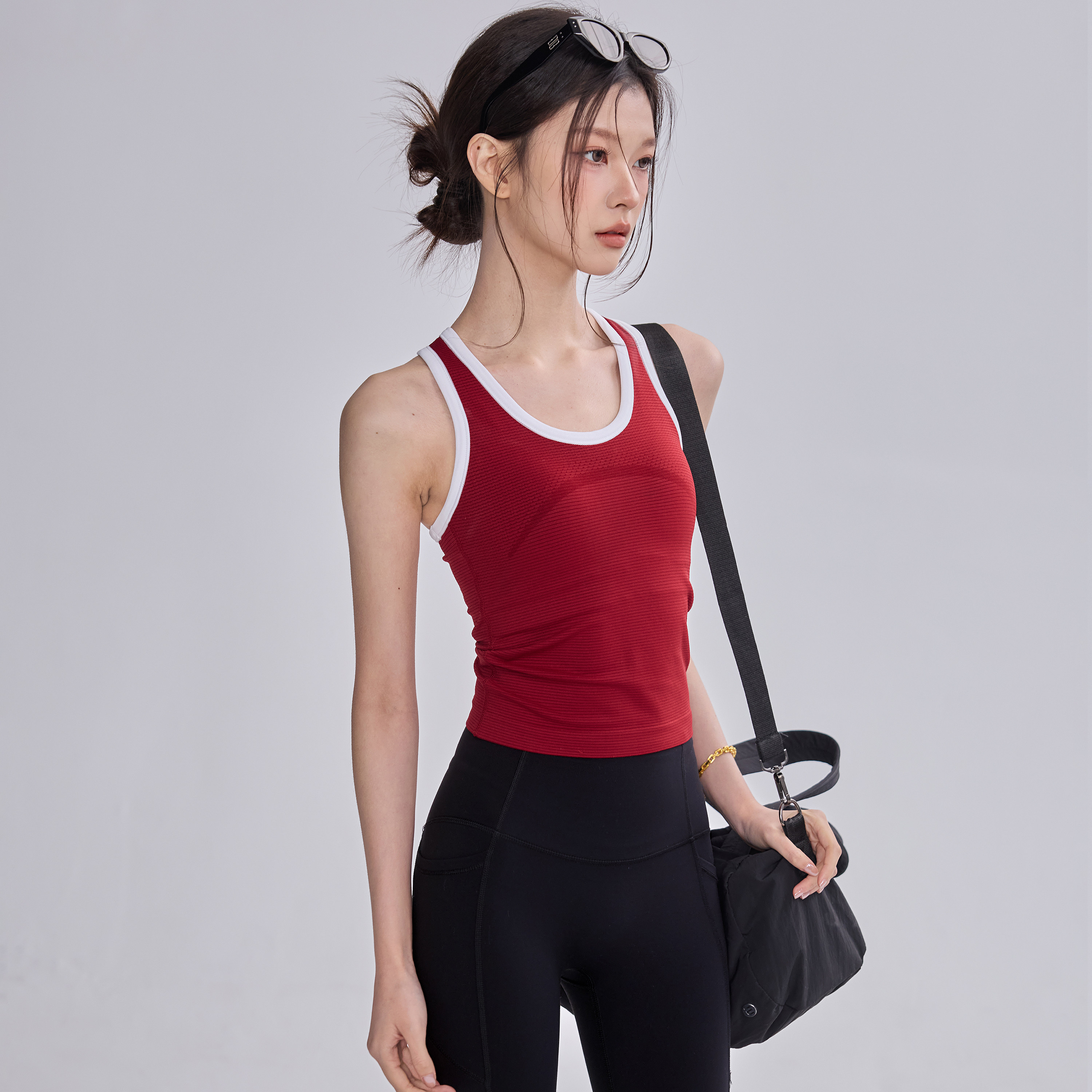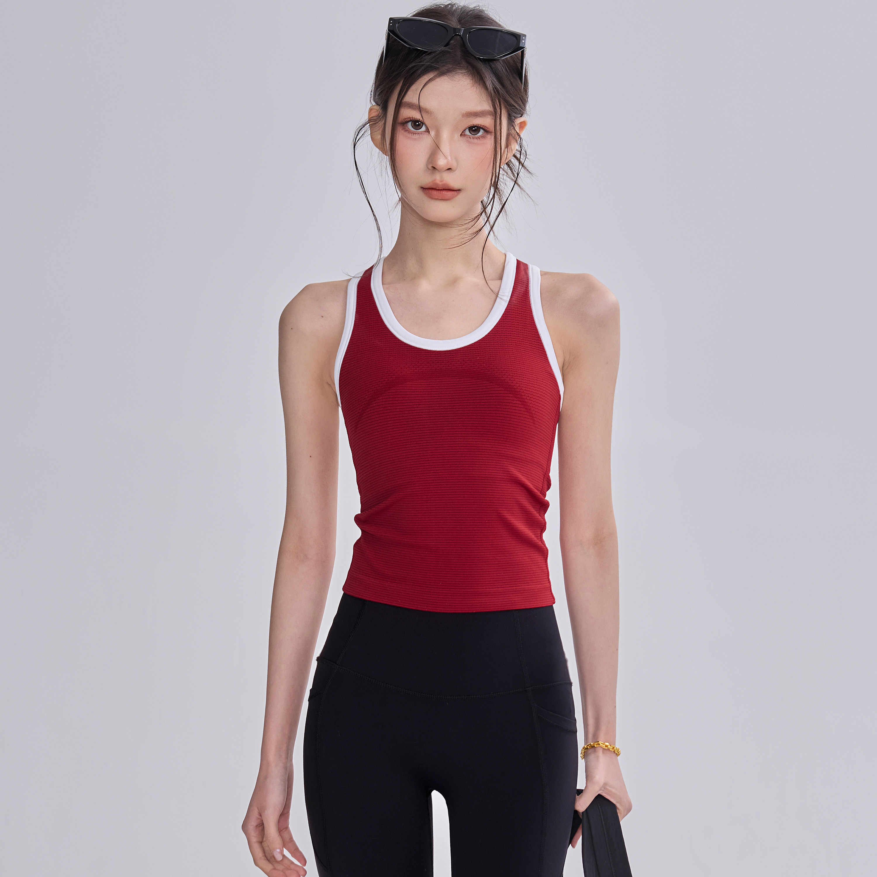运动背心女一体式固定杯普拉提训练跑步健身上衣红色瑜伽套装春夏