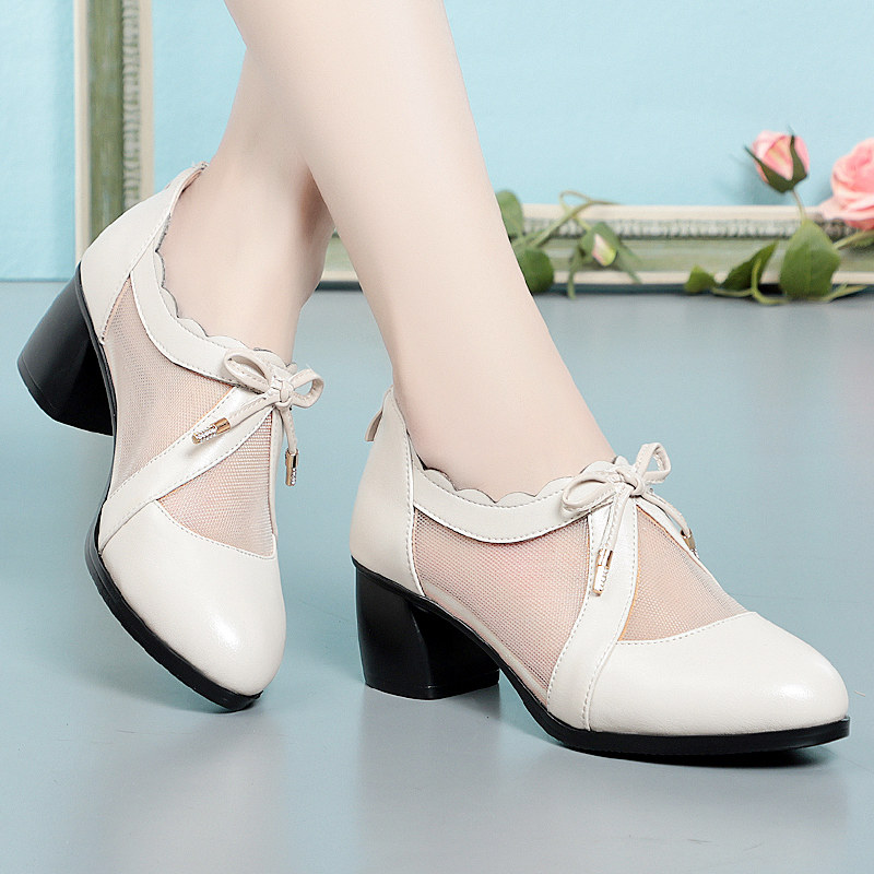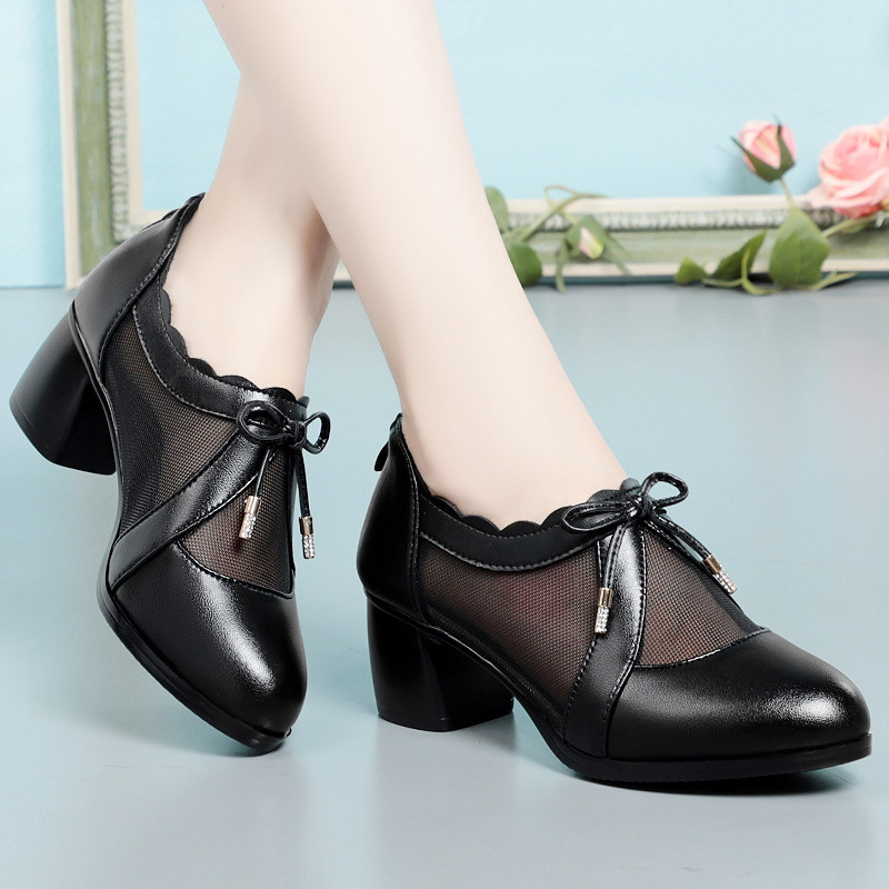 夏天网面透气女鞋中跟真皮软底镂空单鞋粗跟中年女士妈妈跳舞皮鞋