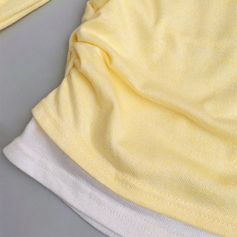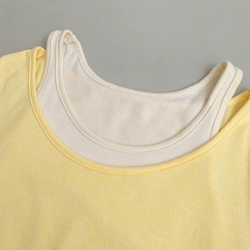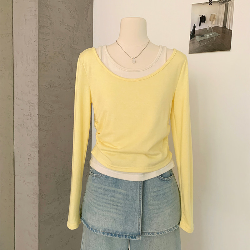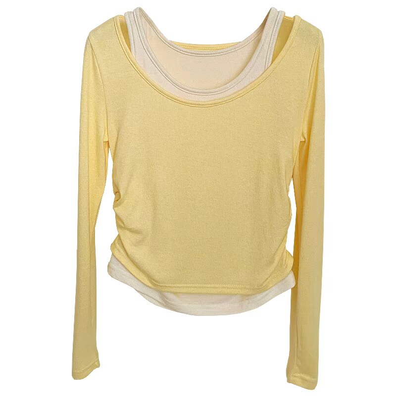 韩系2026早春新款黄色假两件长袖T恤女短款修身叠穿打底衫上衣