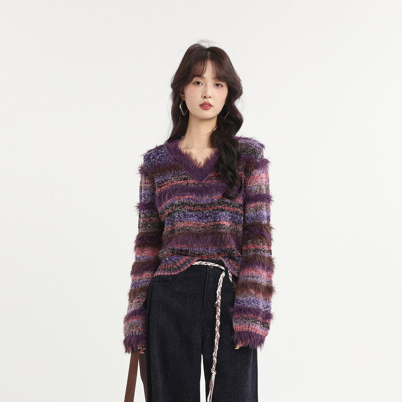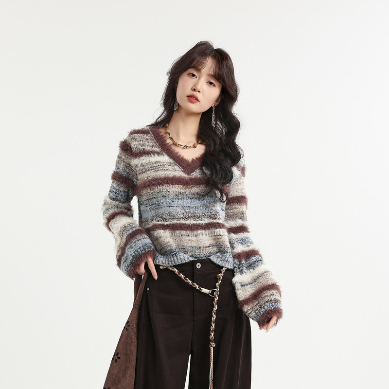 记忆的起点V领毛衣2026春季新款条纹宽松显瘦优雅风上衣70AC59281