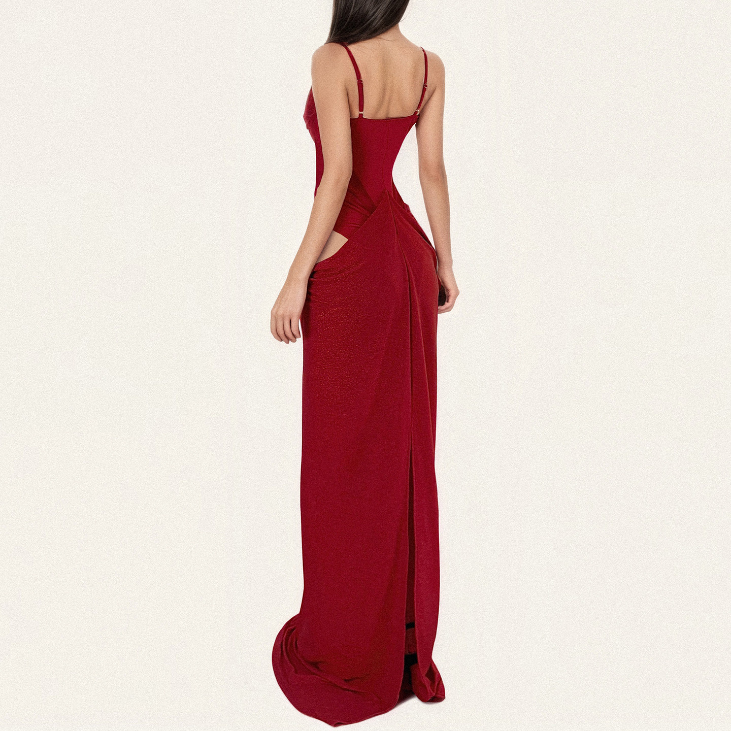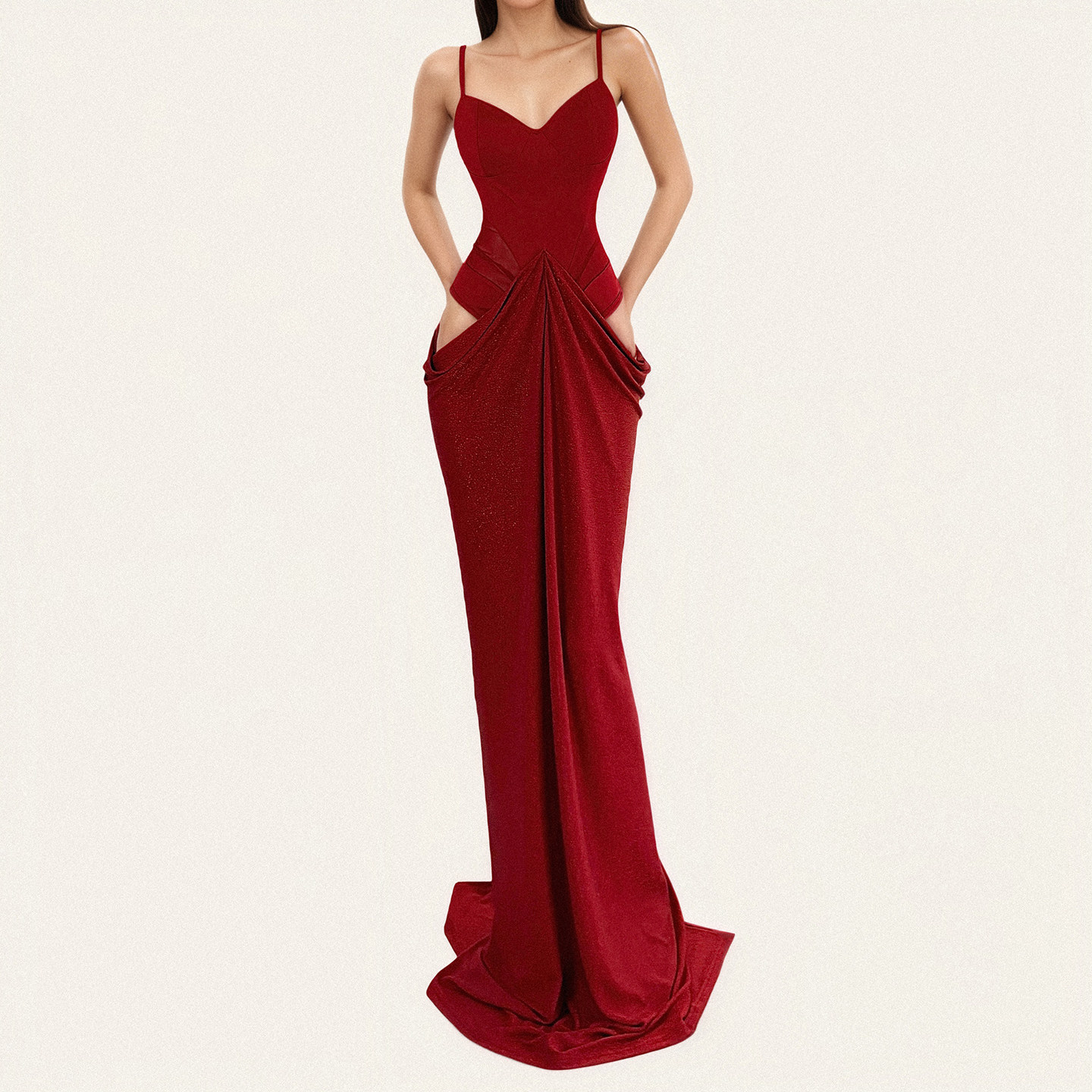 FUNOFF简约红色低胸束腰吊带鱼尾长裙性感透视修身收腰开叉连衣裙