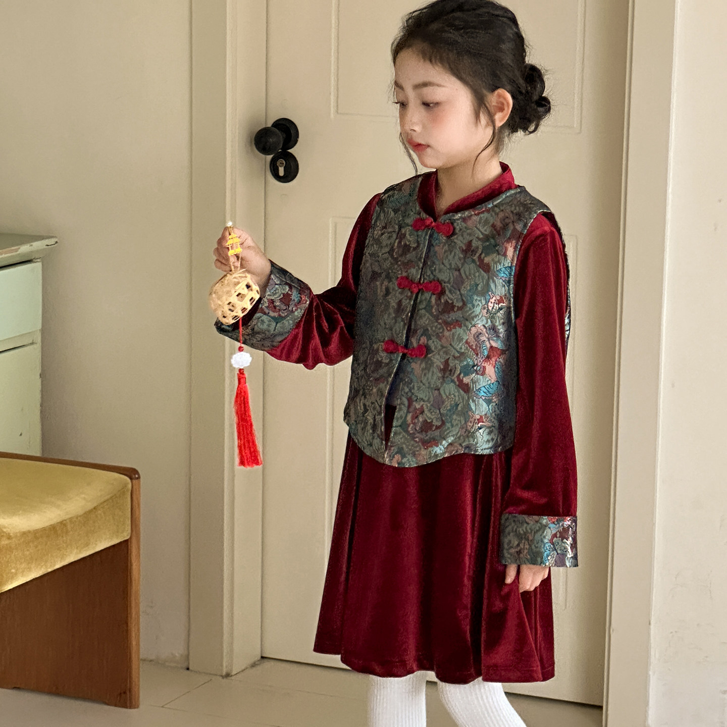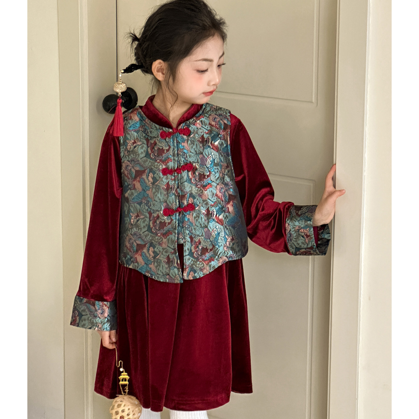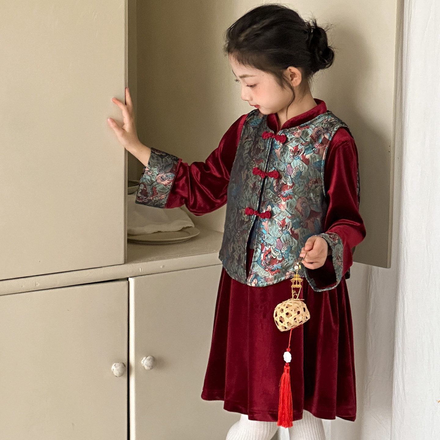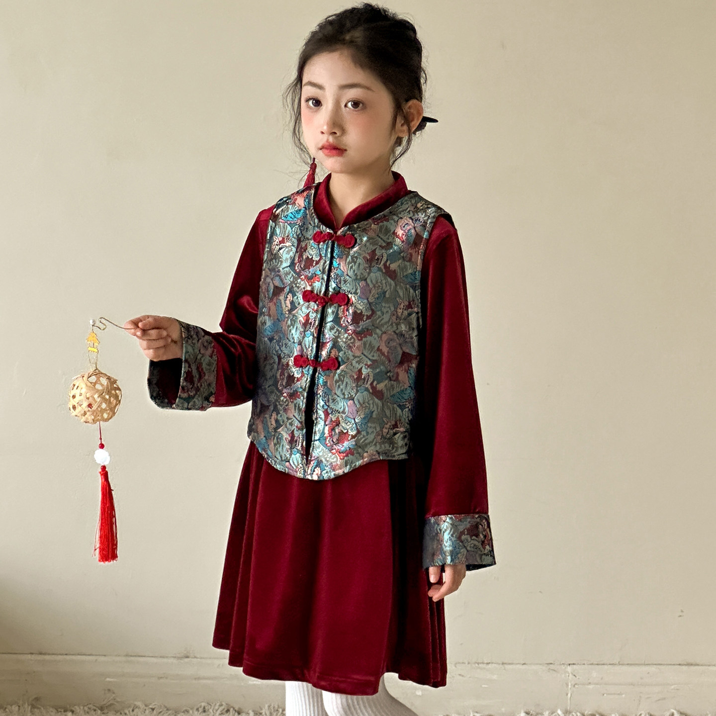 女童中国风新年套装2026冬季新款儿童旗袍马甲女大童拜年服两件套