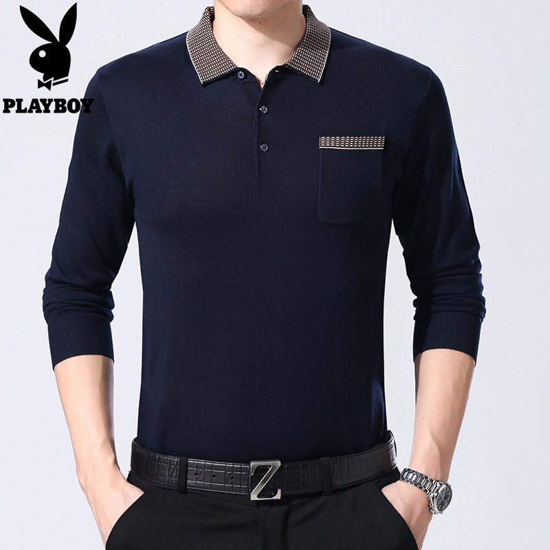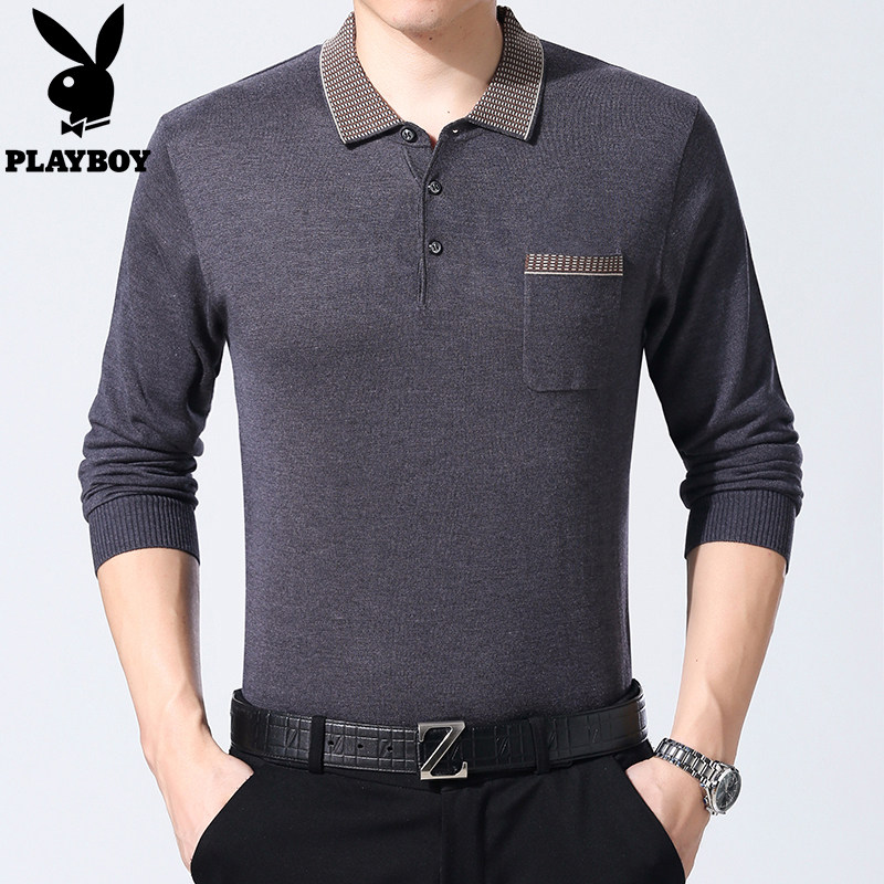 花花公子薄款中年男款长袖t恤宽松真口袋爸爸本命年红色婚宴衣服