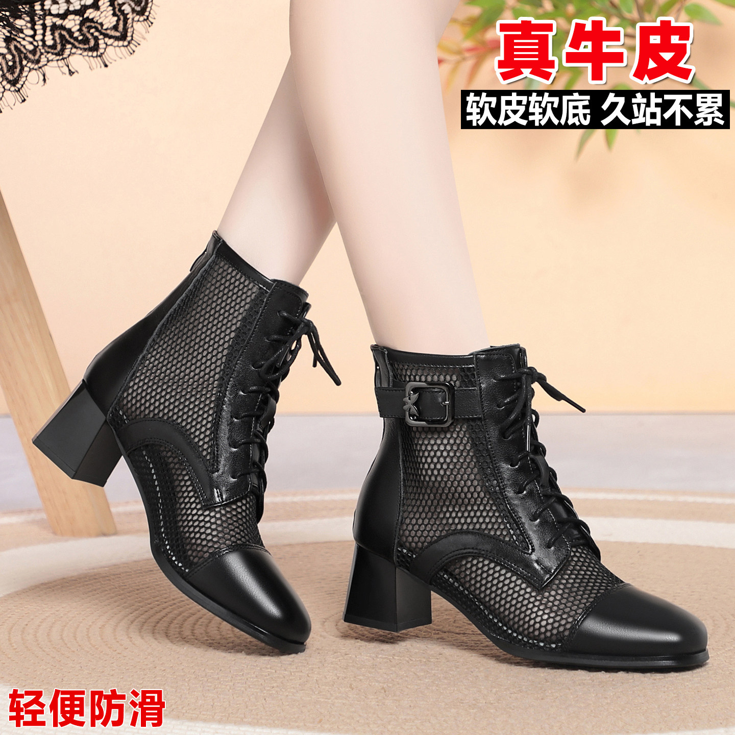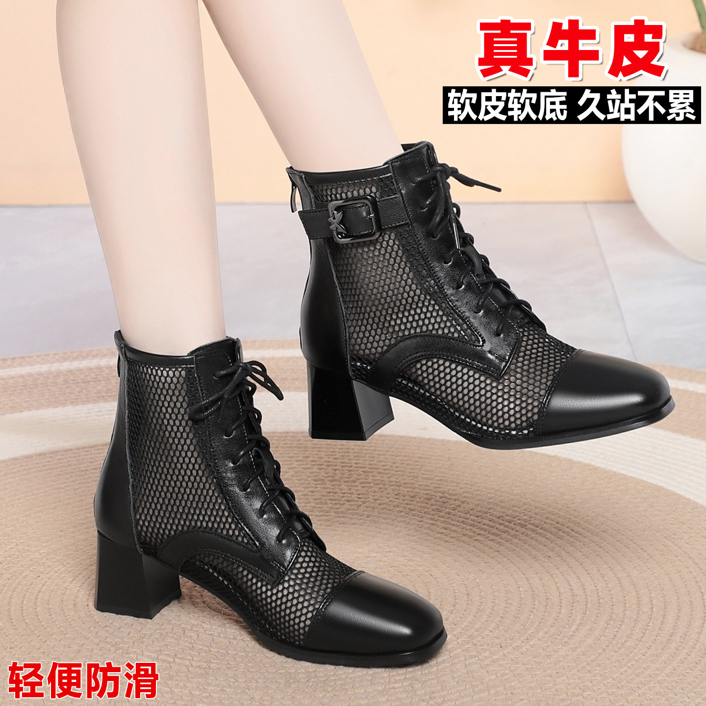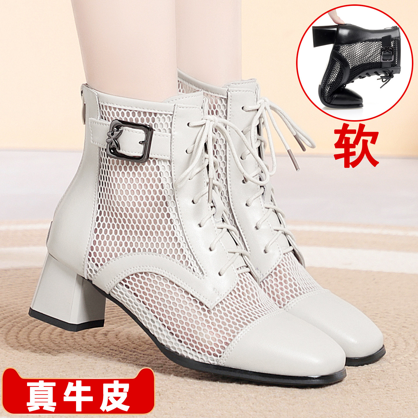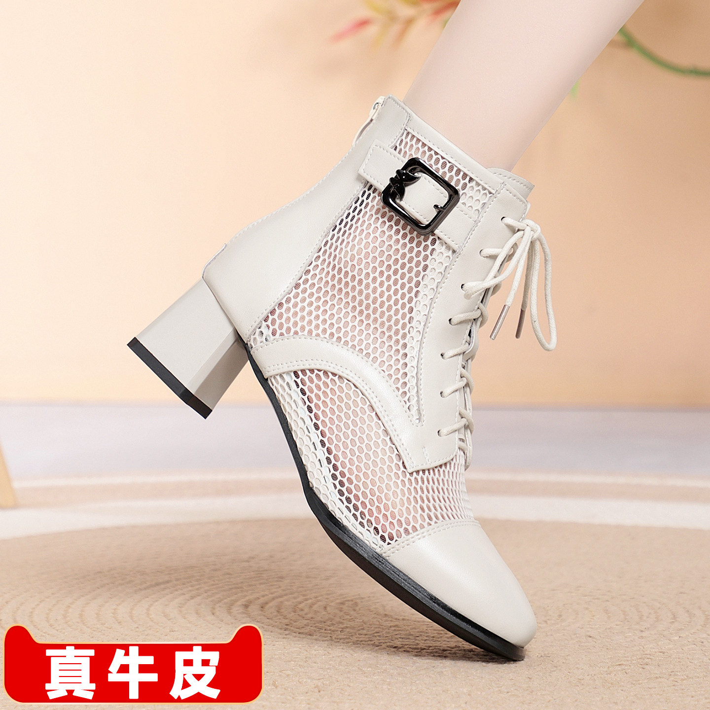 白色短靴女款春夏薄款靴子中年女士妈妈高跟真皮网纱凉靴镂空鞋子