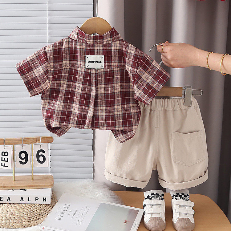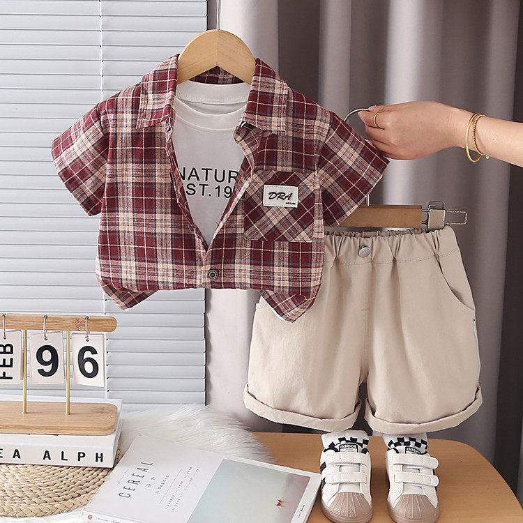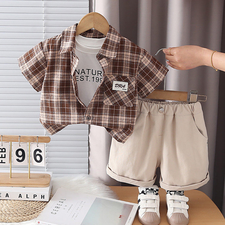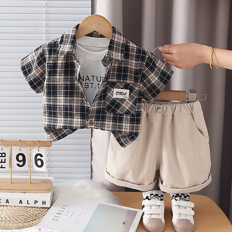 男童夏季韩版套装2026夏款新款格子衬衫短袖背心T恤短裤三件套酷
