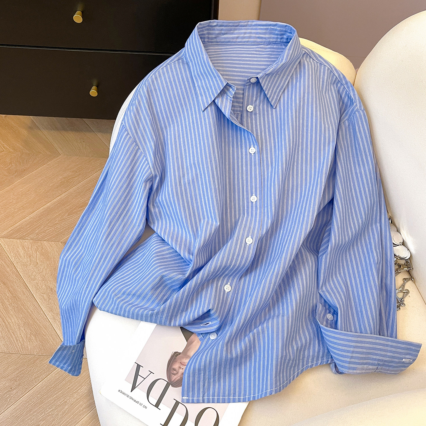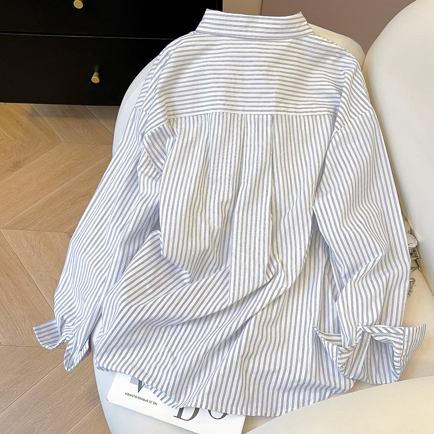 小C家 条纹衬衫女款2026新款春季外搭宽松慵懒风前短后长纯棉衬衣