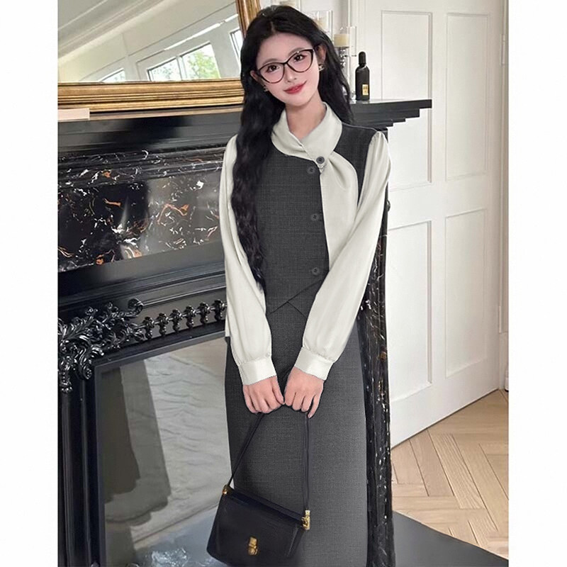 有里布2026春季新款长袖连衣裙气质高级感假两件法式长裙D4727