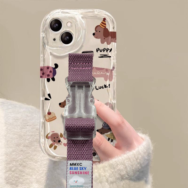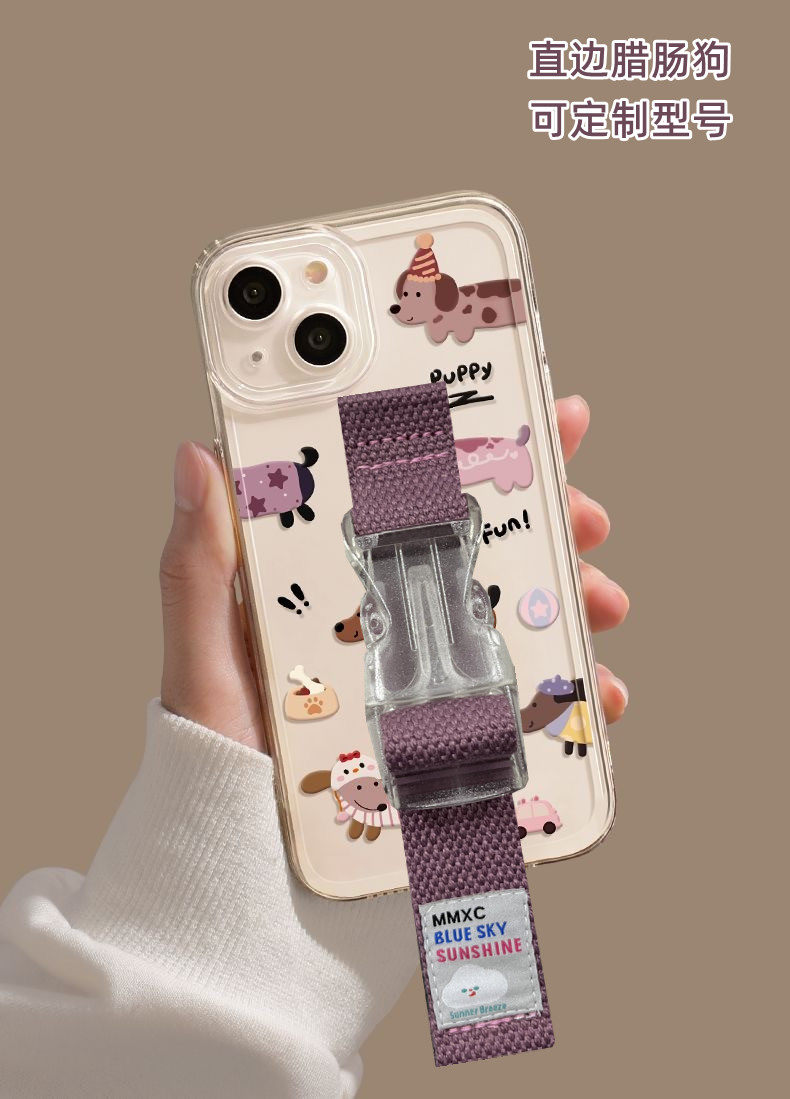 ins少女卡通腊肠狗适用苹果17 16 15腕带手机壳iPhone14 13 12华为mate60 pro 70支架支架三星小米15定制型号