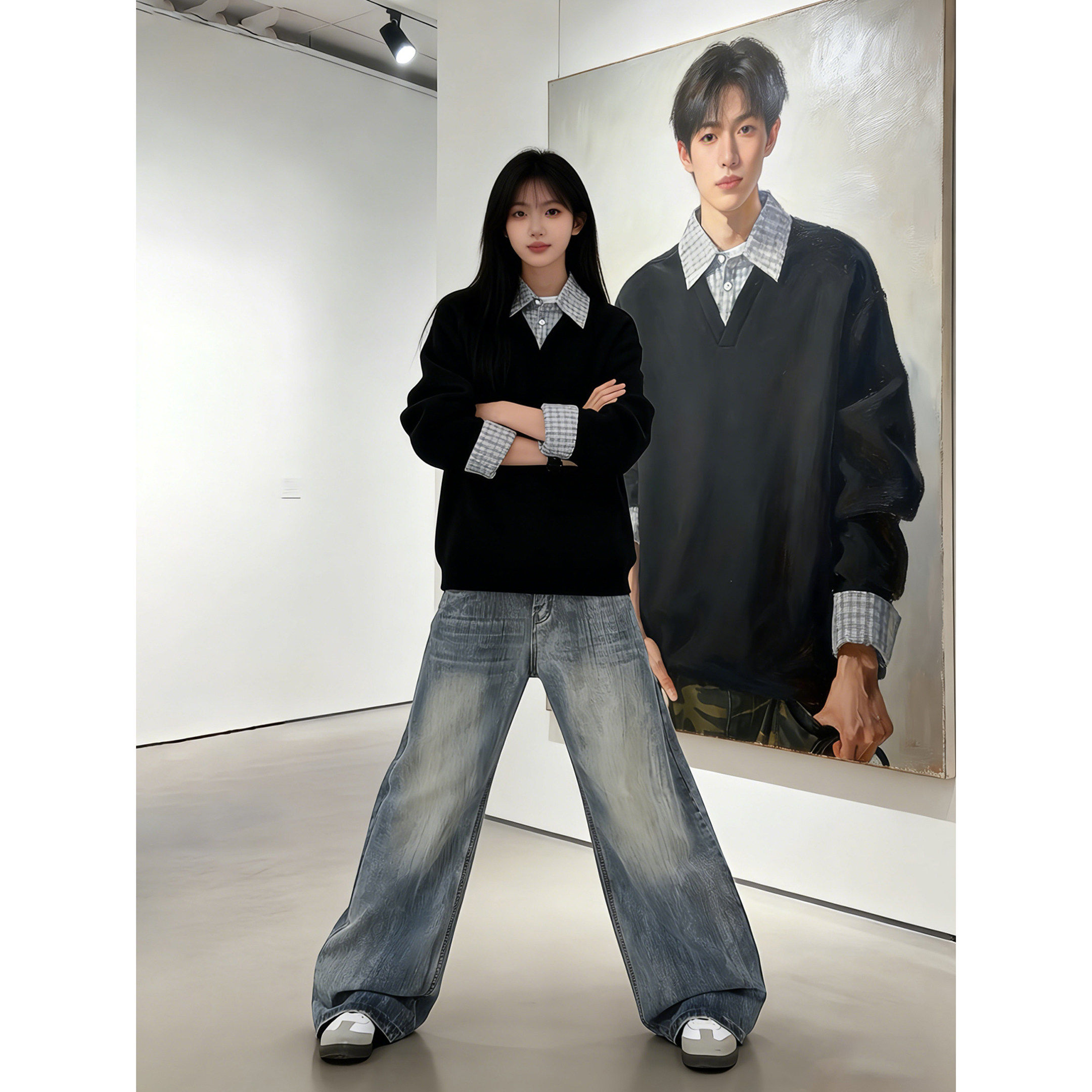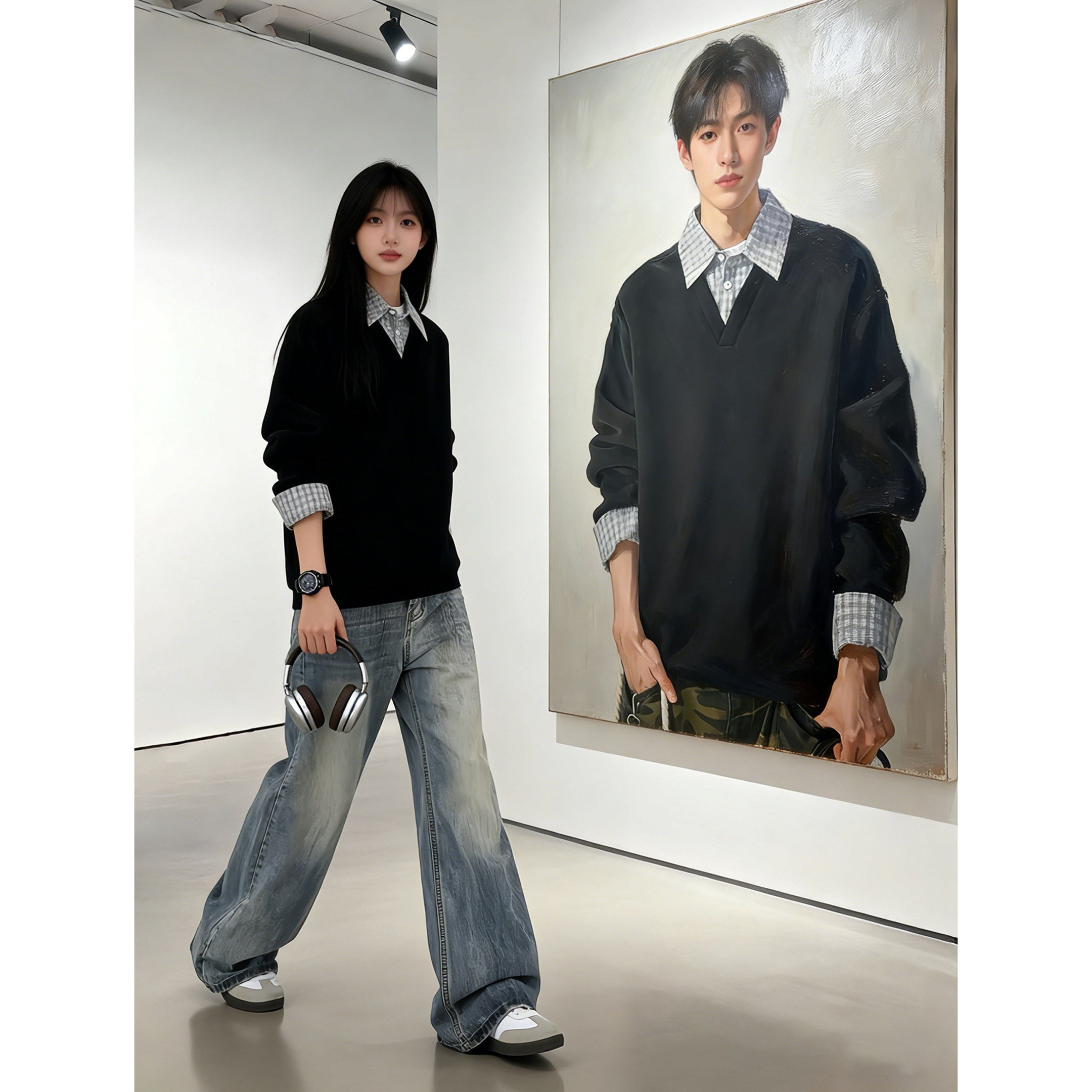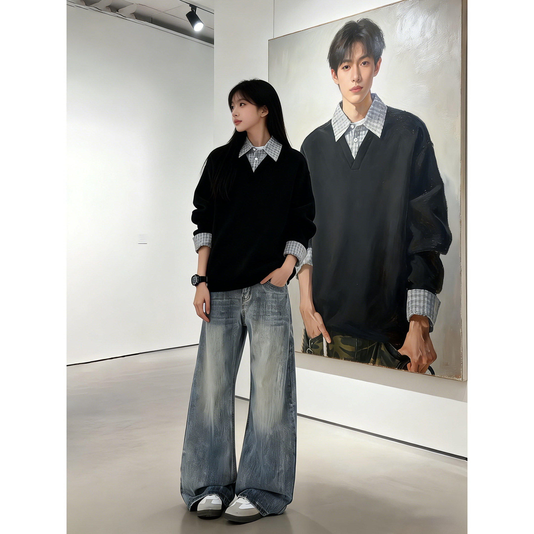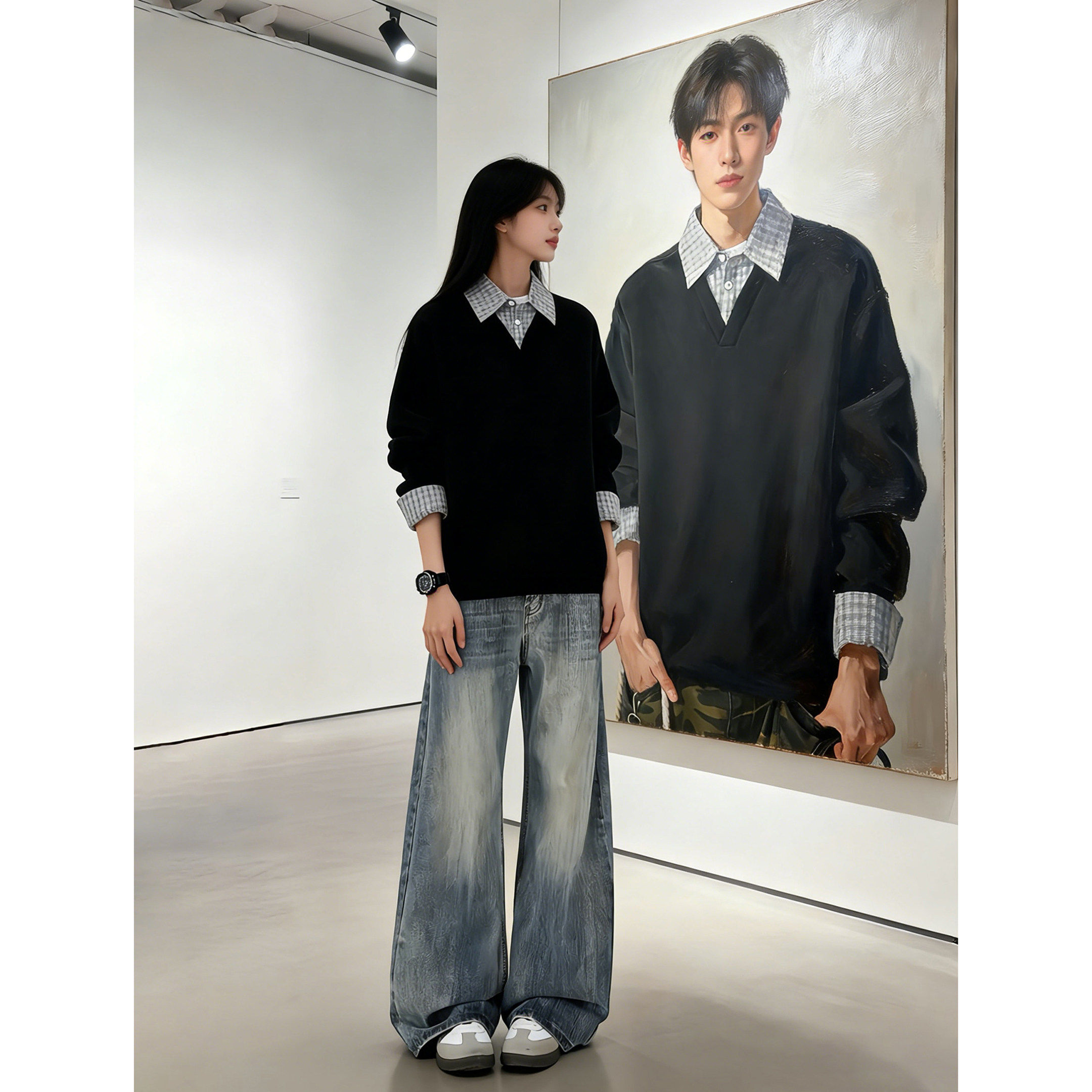假两件翻领Polo卫衣男女款春季撞色拼接情侣外套重磅内搭打底上衣