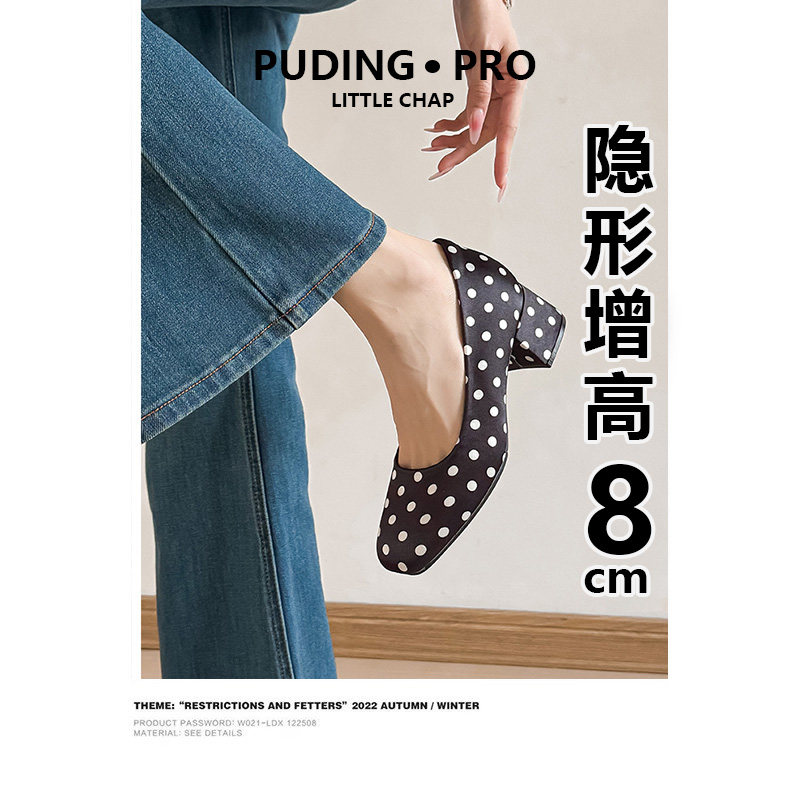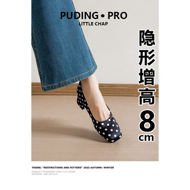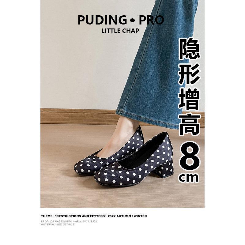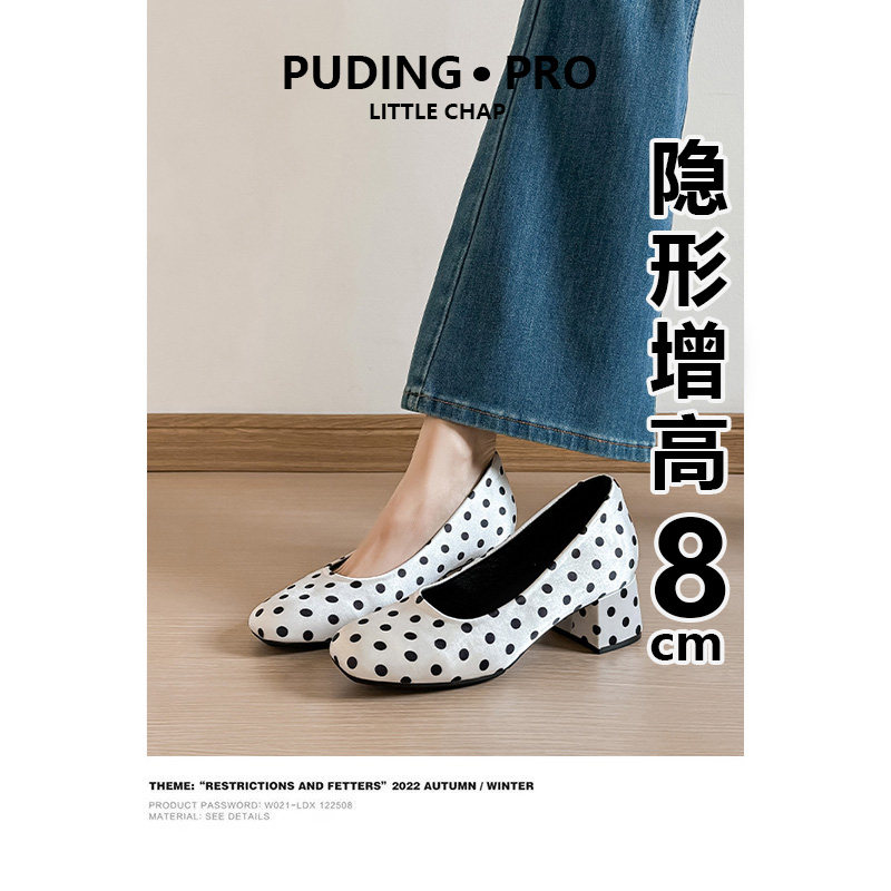 内增高单鞋女2026新款春秋白色波点方头浅口小个子8cm粗跟高跟鞋