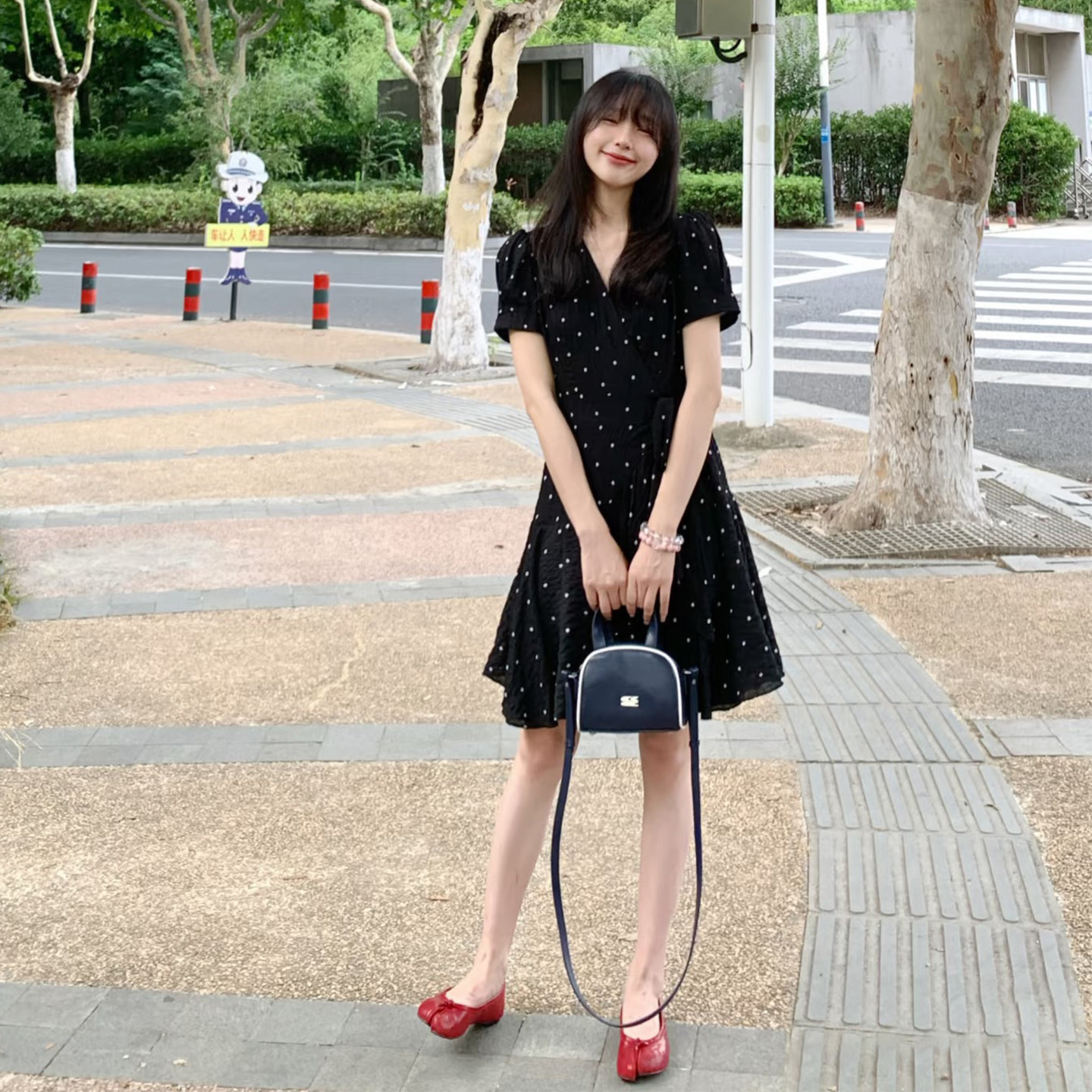 法式赫本风黑色波点连衣裙女夏季V领收腰一片式茶歇裙小个子短款