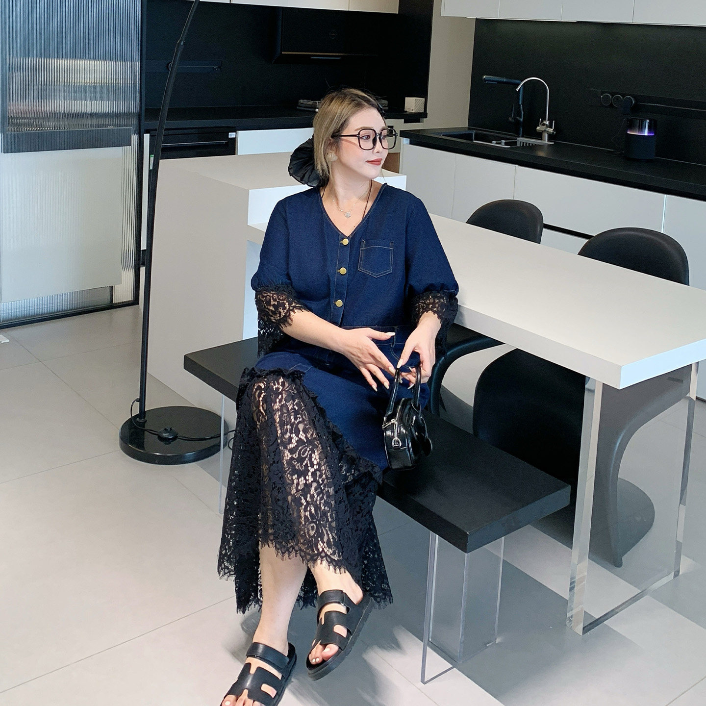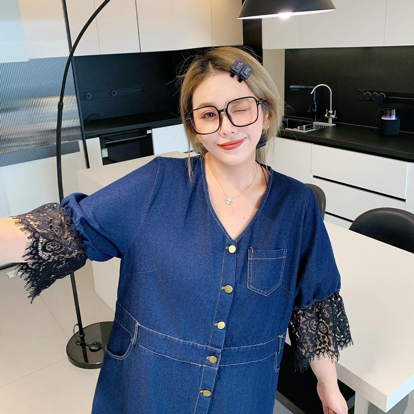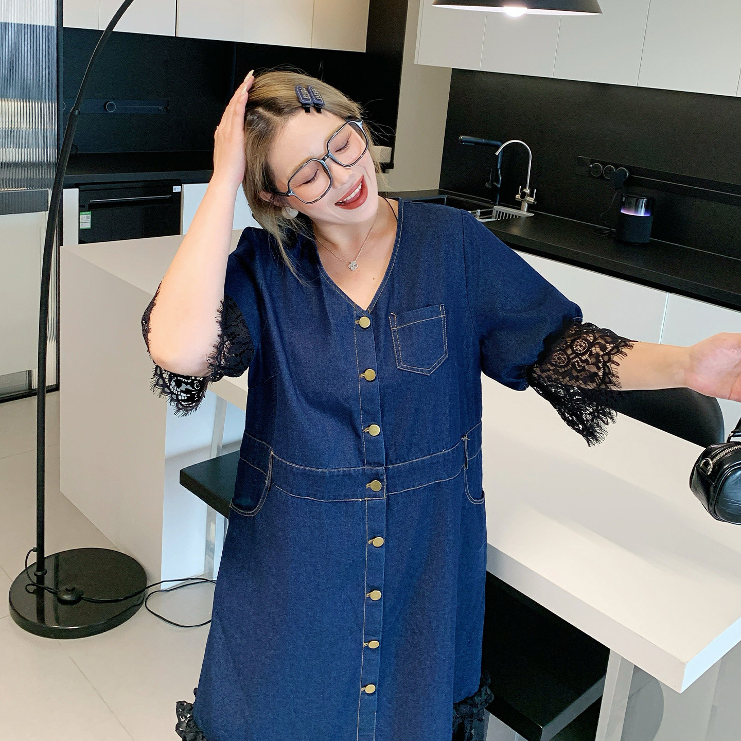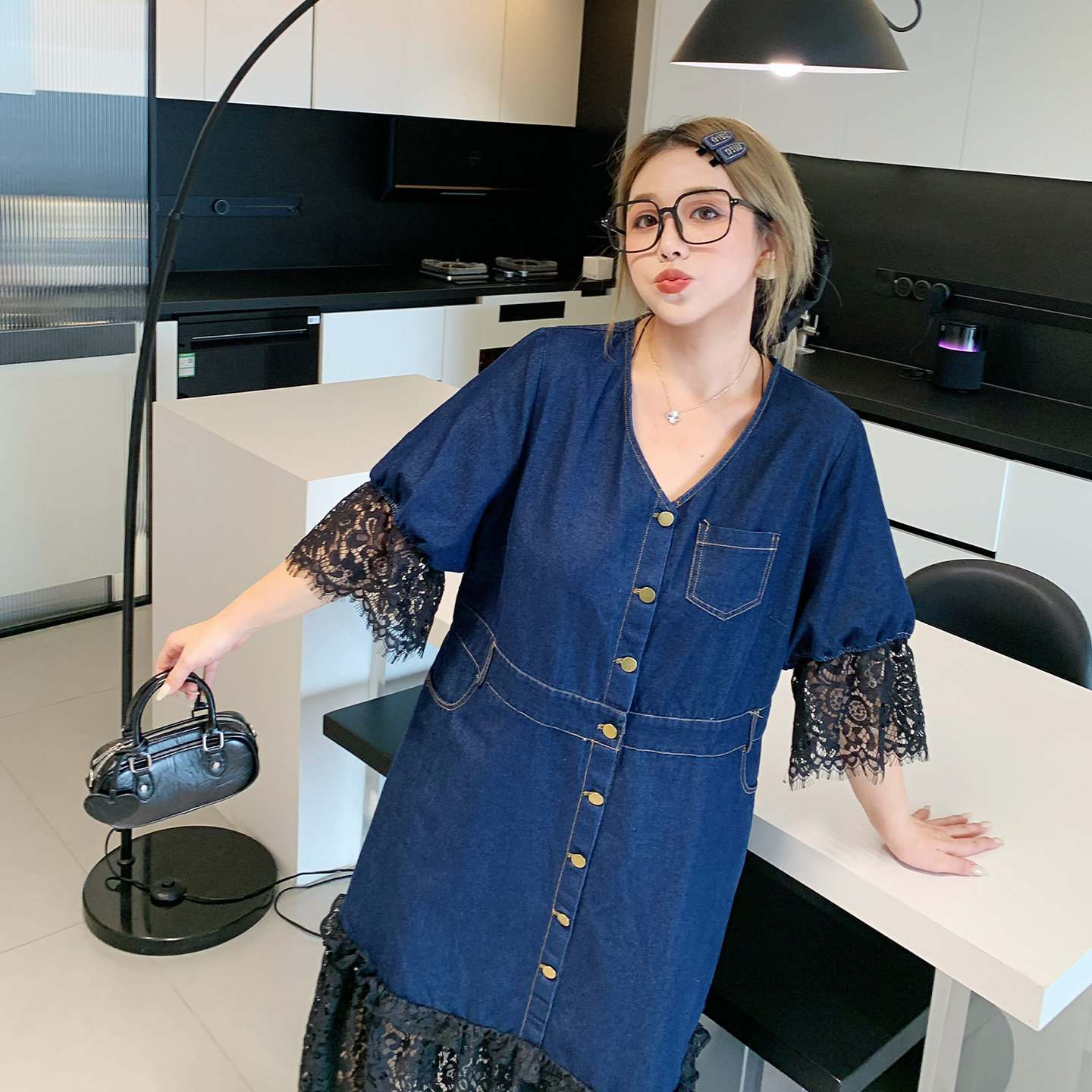 媛子家大码夏季新款重工胖mm拼接蕾丝牛仔连衣裙长裙修身显瘦轻奢