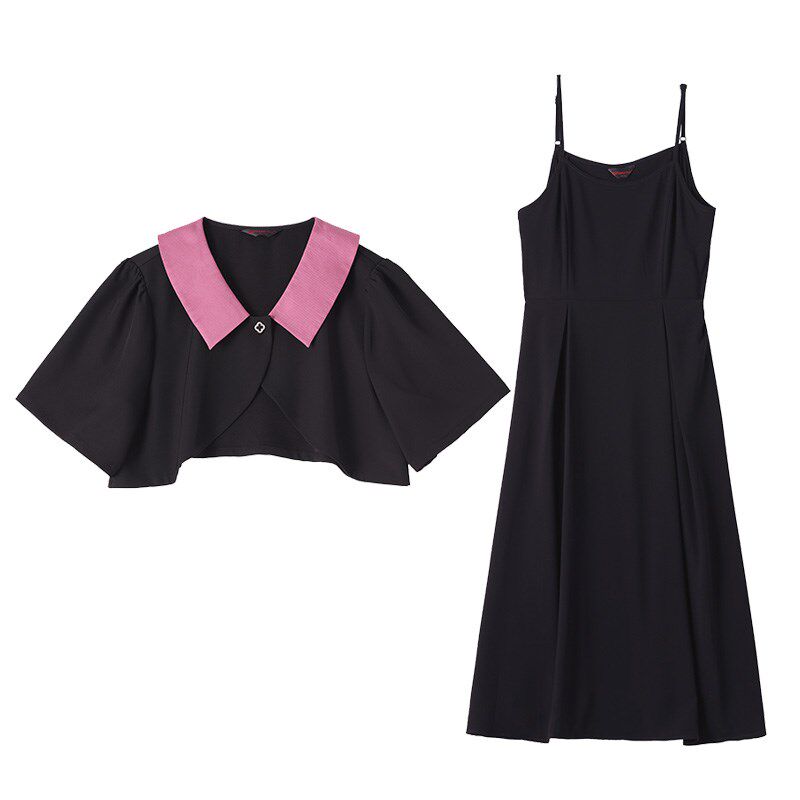大码女装两件套装夏季新款长款吊带连衣裙显瘦胖mm短袖披肩小外套