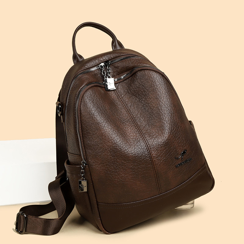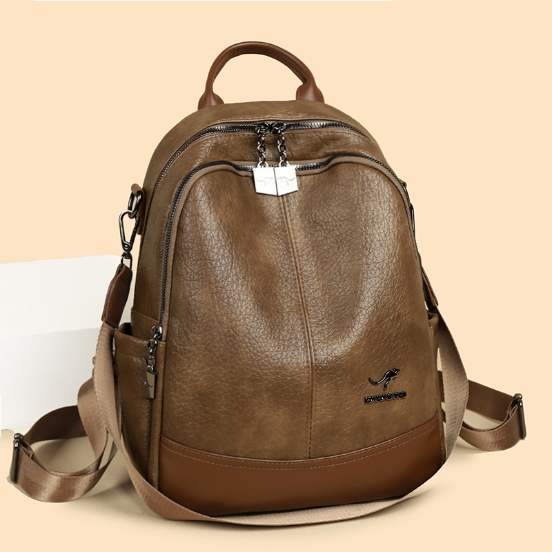 袋鼠真皮女士双肩包女2025新款时尚复古旅行大容量软牛皮背包百搭