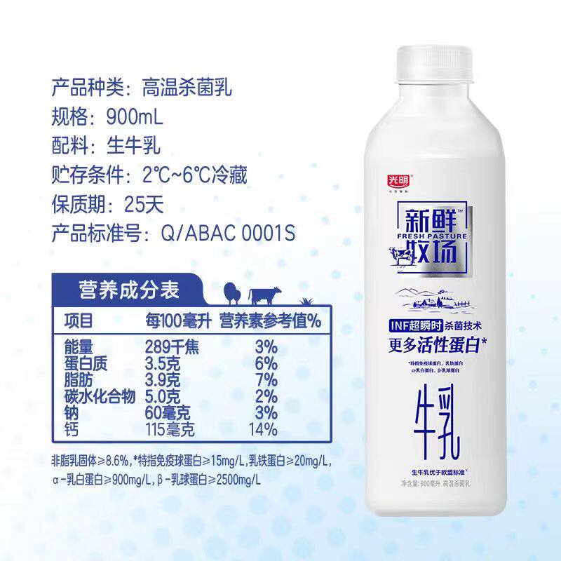 光明新鲜牧场纯牛奶900ml/瓶低温活性蛋白儿童孕妇营养早餐牛奶