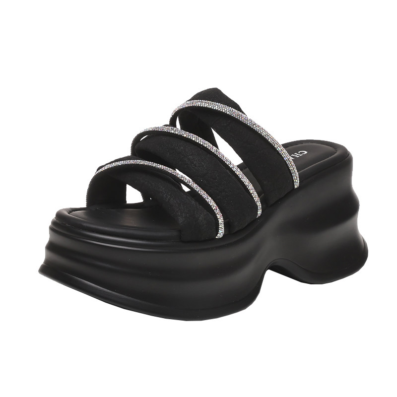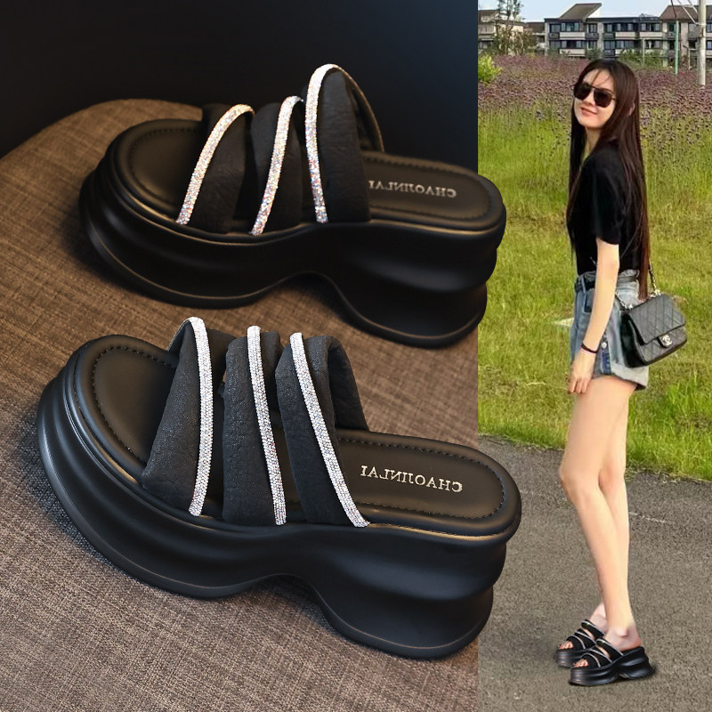 ZFCQ新款厚底增高小个子拖鞋女款夏外穿真皮2026水钻可湿水一字拖