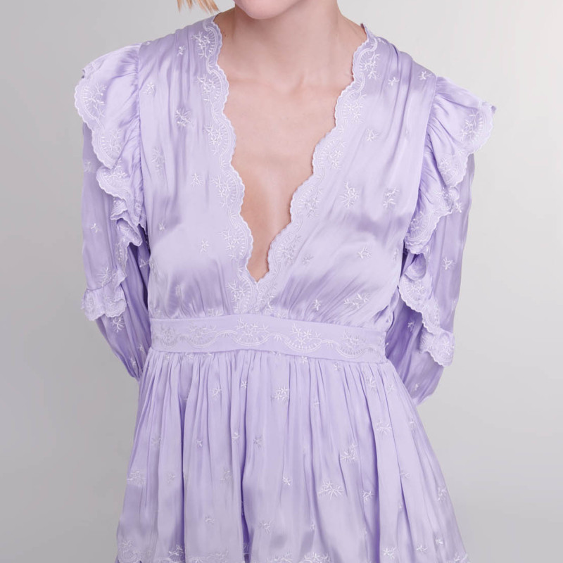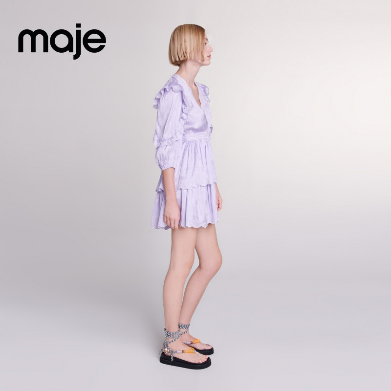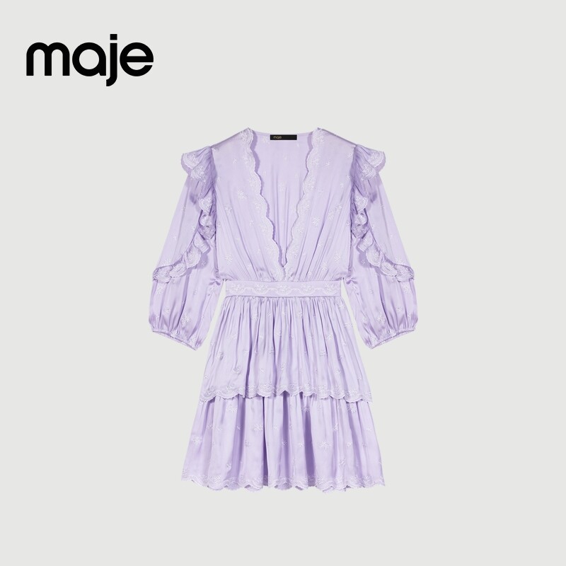Maje春夏女装法式简约优雅时尚V领短款长袖收腰公主蛋糕连衣裙