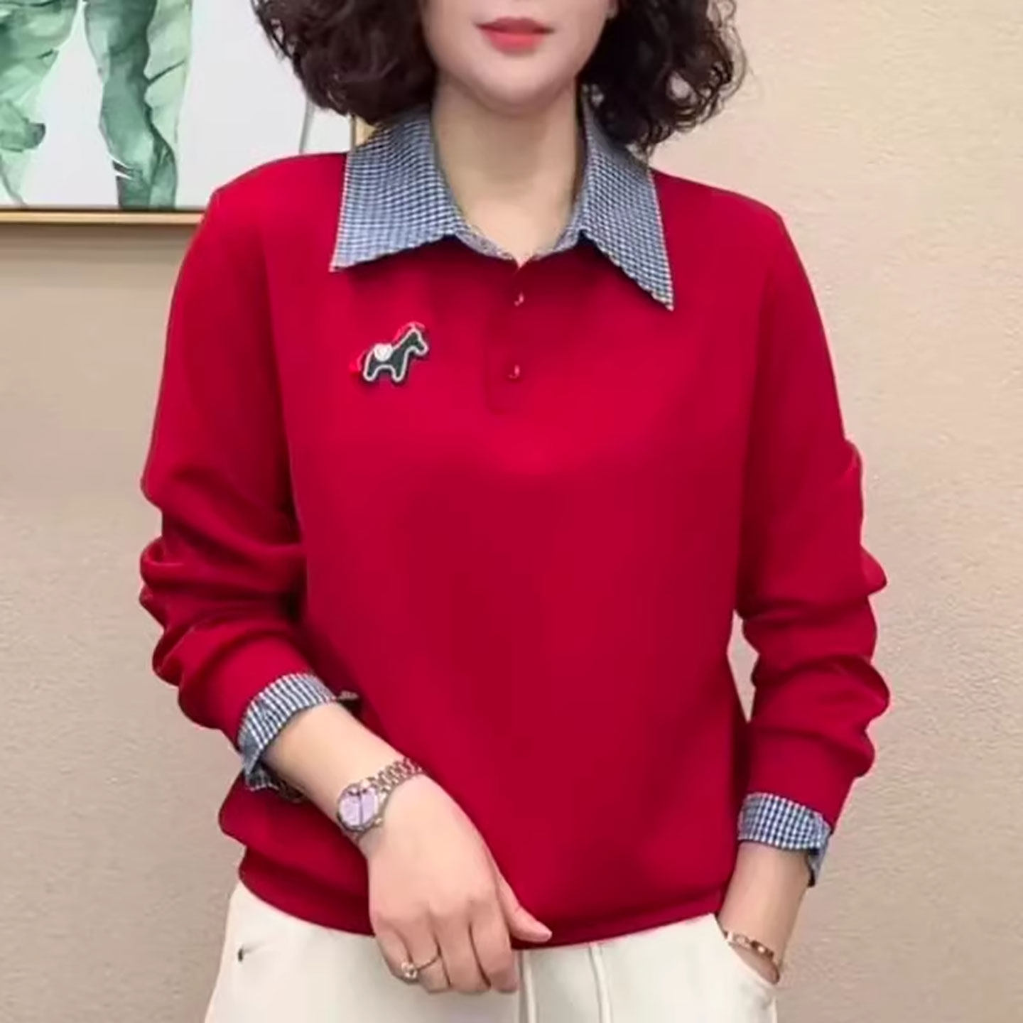 洋气假两件卫衣女款春装2026新款妈妈装小个子长袖格子衬衫领上衣