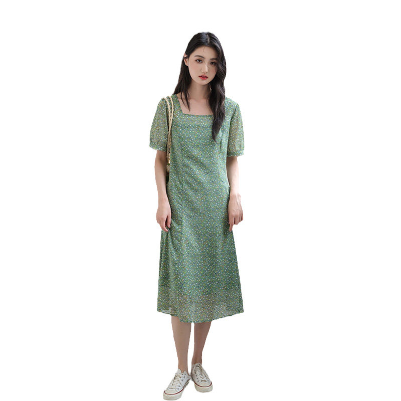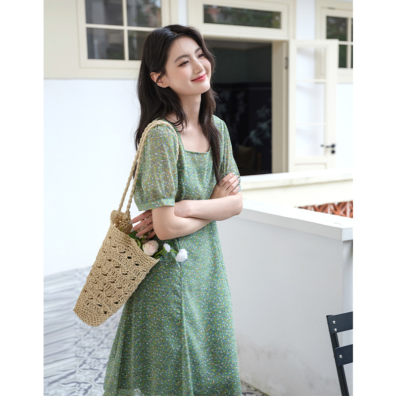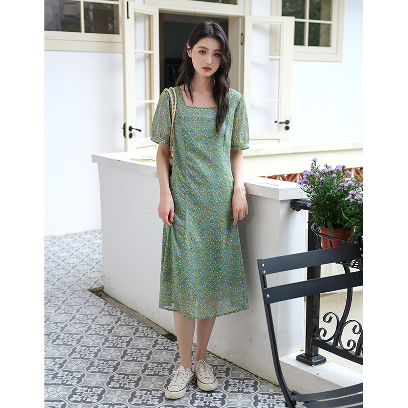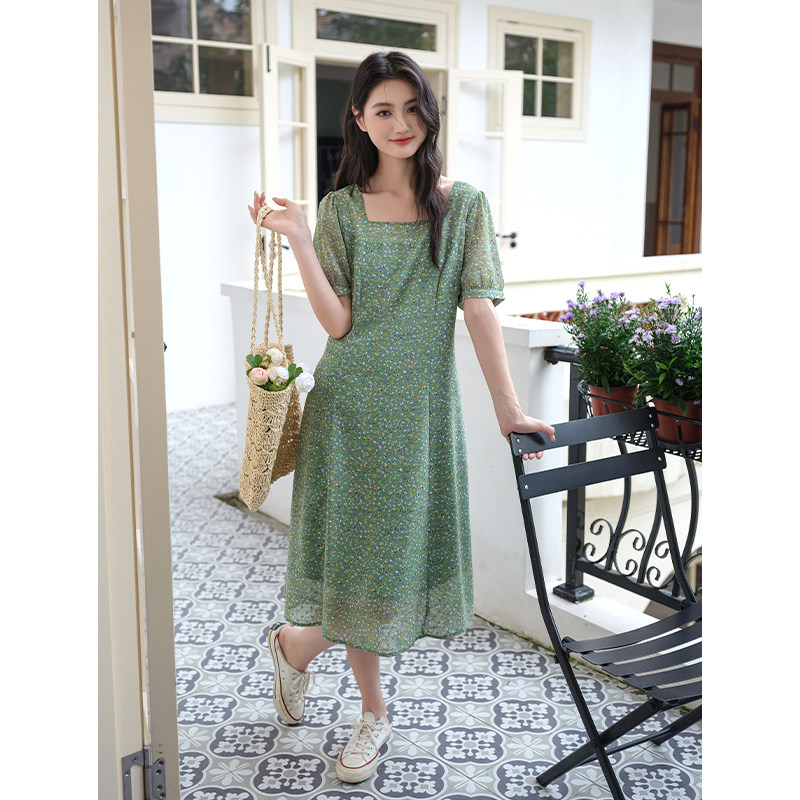 311线报网描述:甜美方领连衣裙显瘦复古碎花雪纺高级感裙子