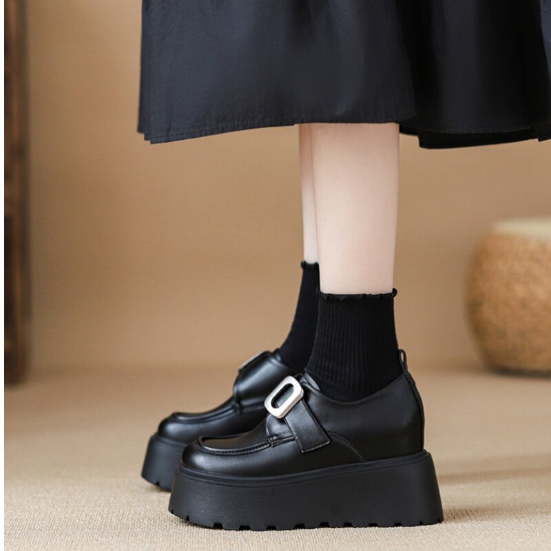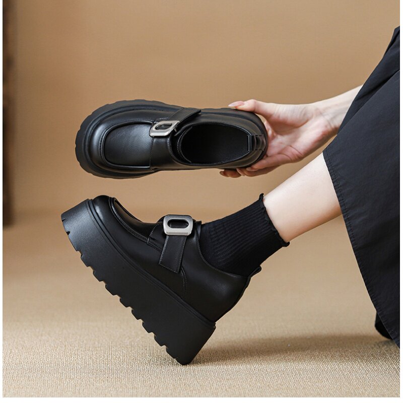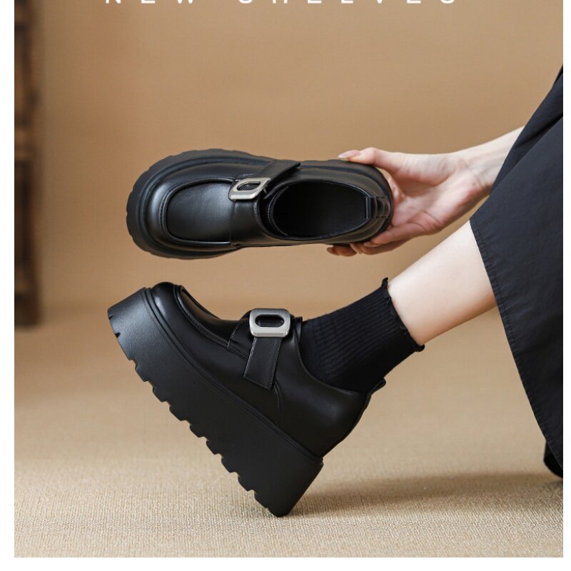 黑色内增高勃肯鞋女10cm一字隐形3334冬工作乐福鞋小个子皮鞋厚底
