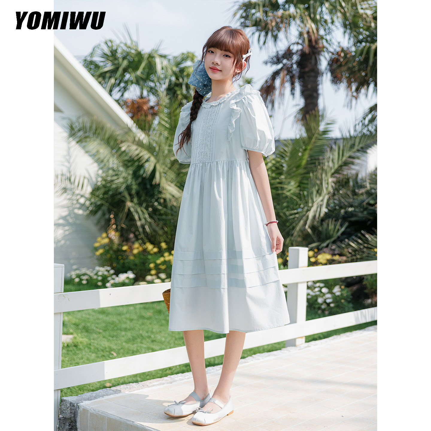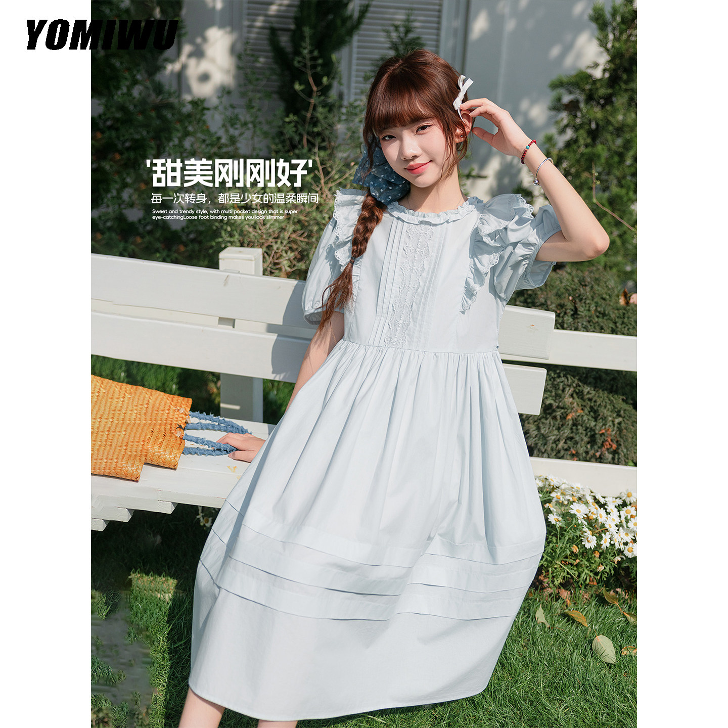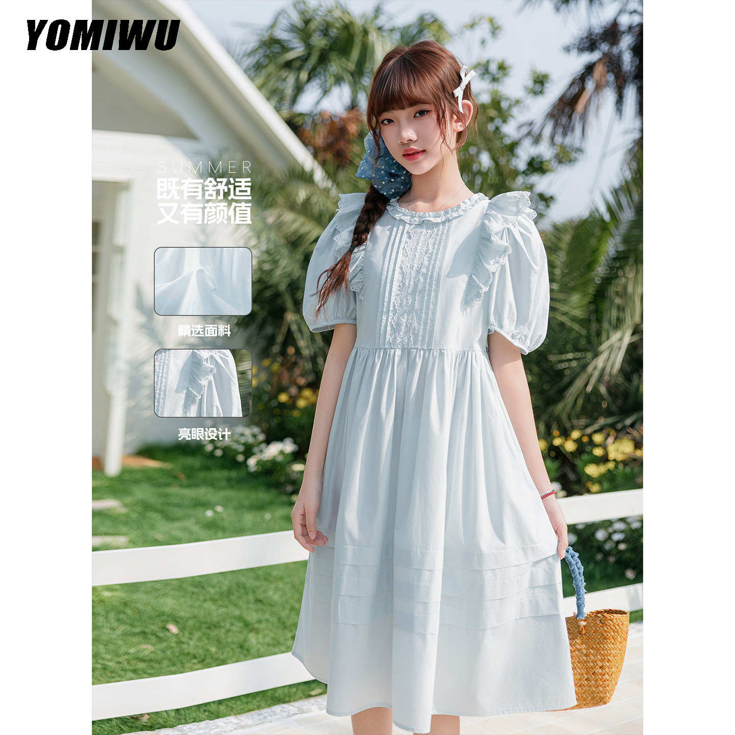 日常风女童连衣裙夏季浅蓝色蕾丝飞袖中长裙女大童青少年学生裙子
