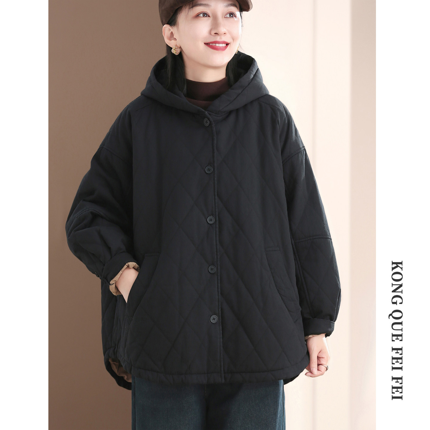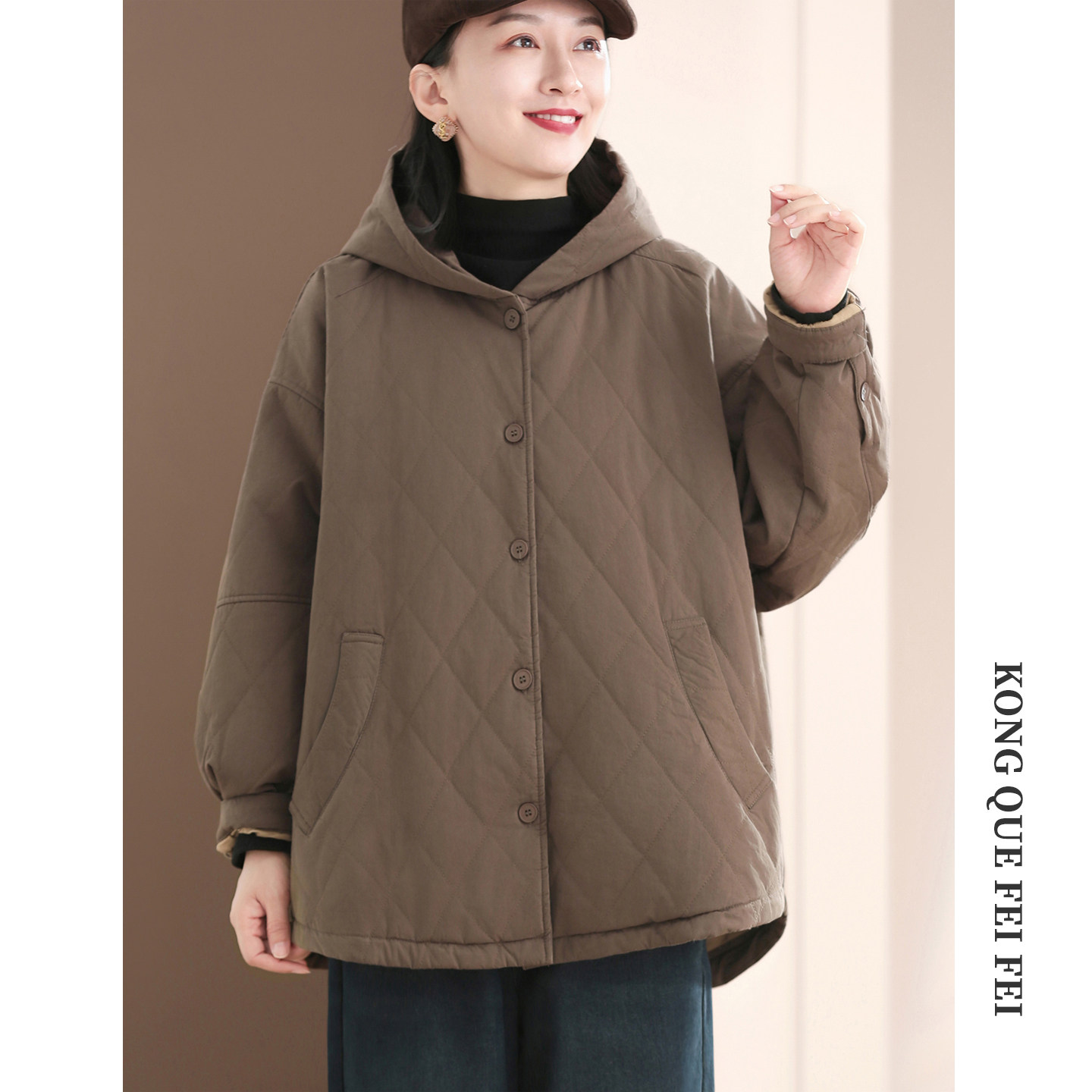 孔雀飞飞冬装韩版大码遮肉菱形格连帽休闲棉衣女款爆款2025新款