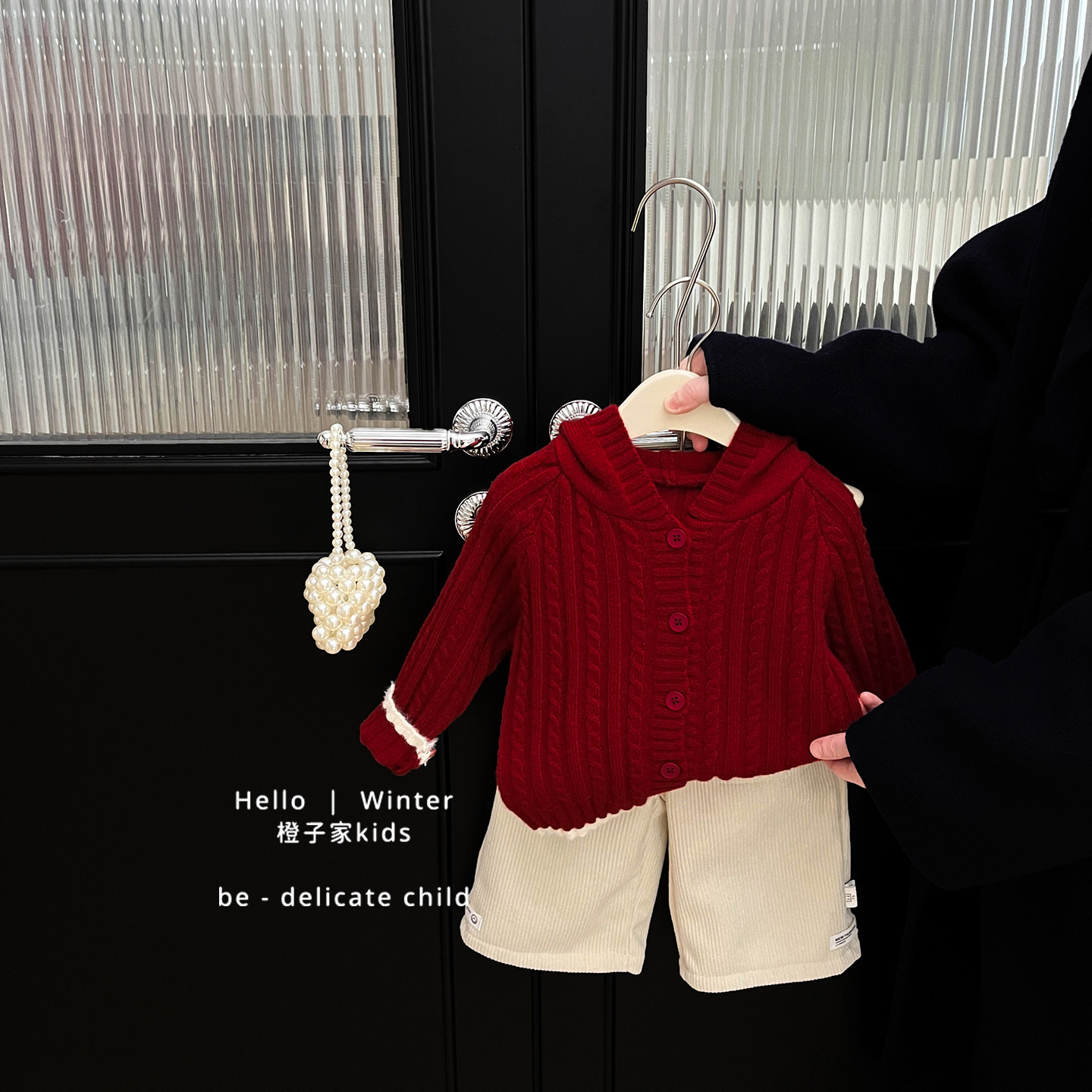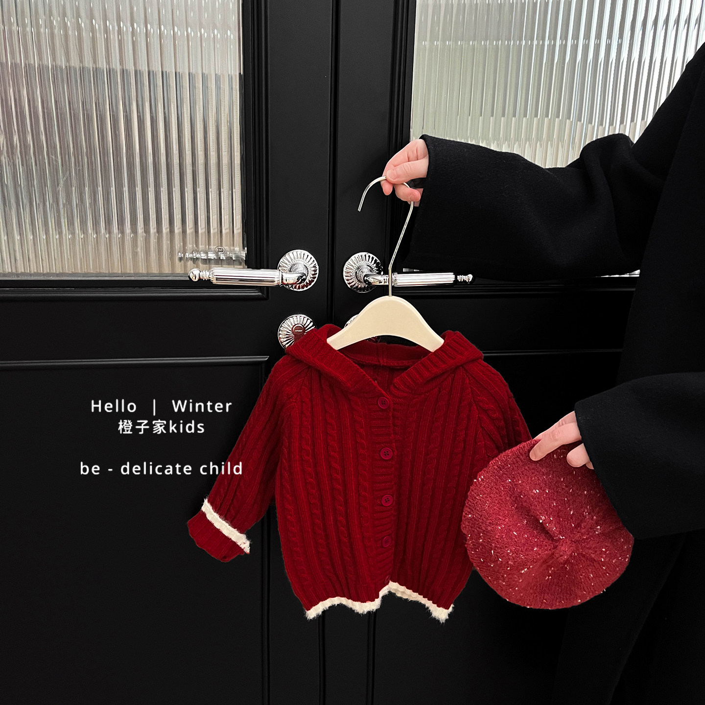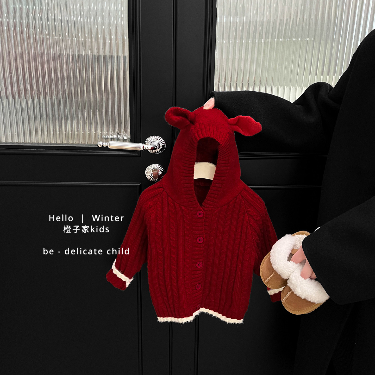 女童冬款新年洋气连帽毛衣女宝宝韩版年服加厚毛衣婴幼儿保暖上衣