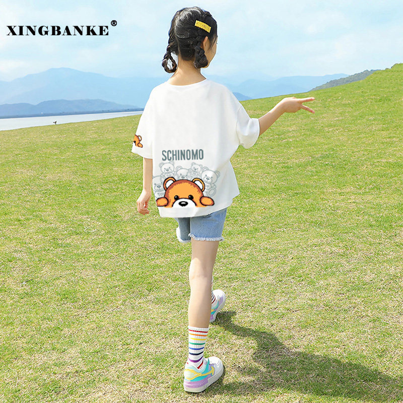 小熊儿童短袖t恤女童白色夏天半袖衣服2025新款时髦洋气纯棉上衣