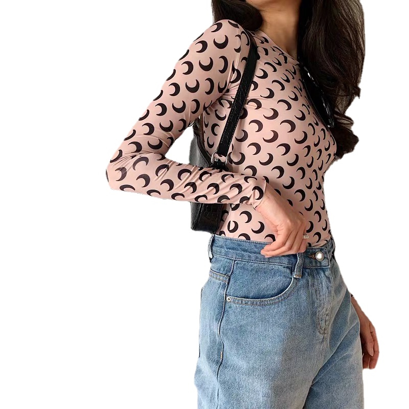月亮印花图案打底衫女修身显瘦圆领长袖T恤2025春秋新款薄款上衣