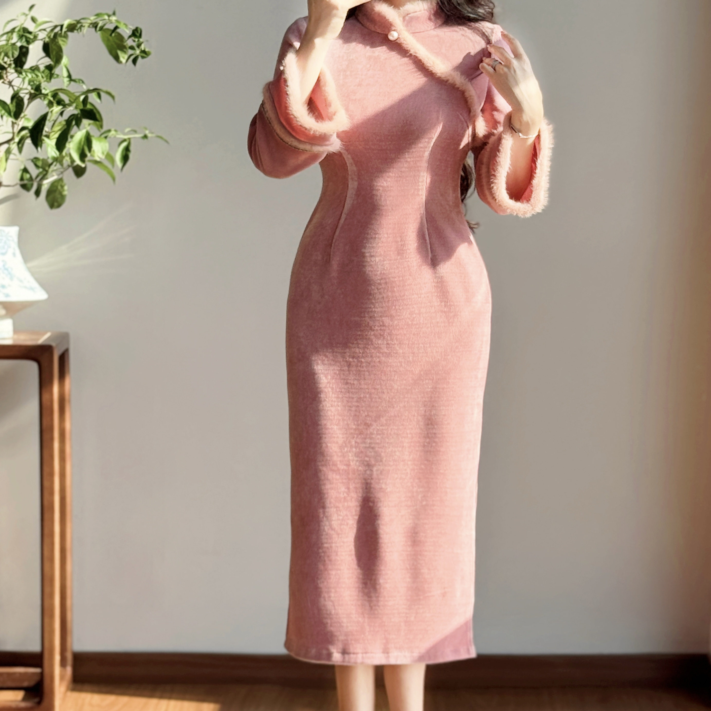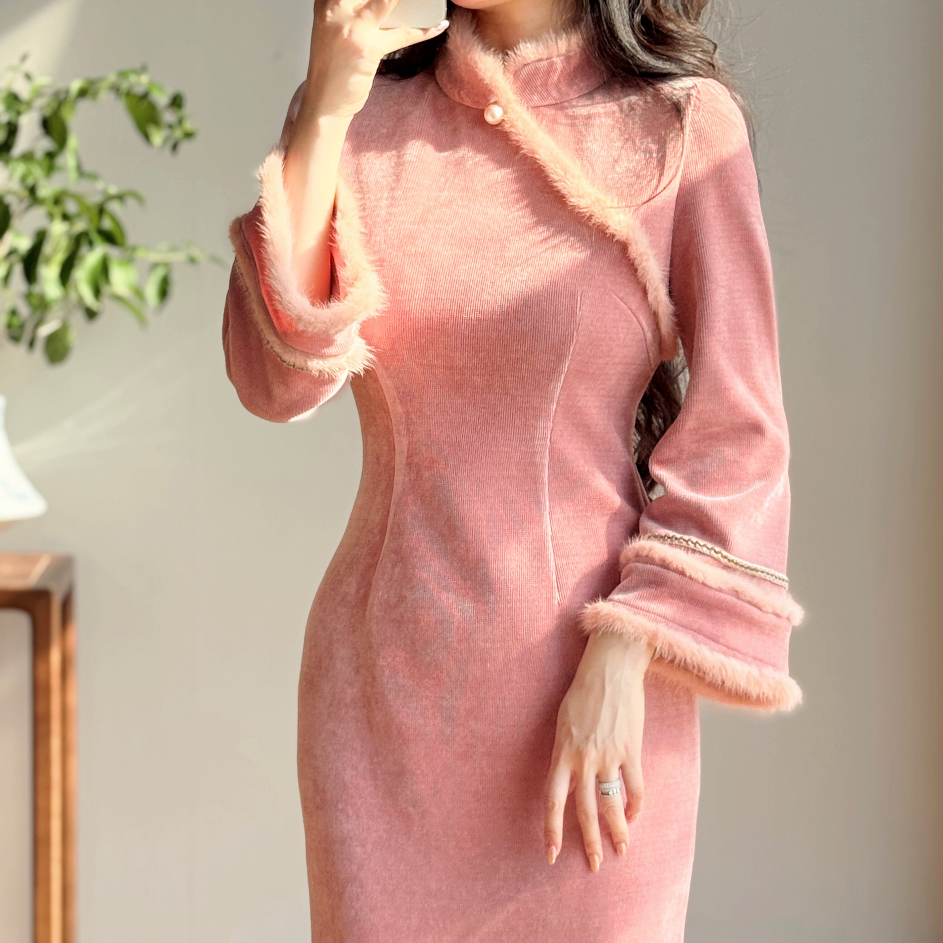 新中式秋冬改良旗袍粉色连衣裙女长袖少女温柔中长款过膝连衣裙